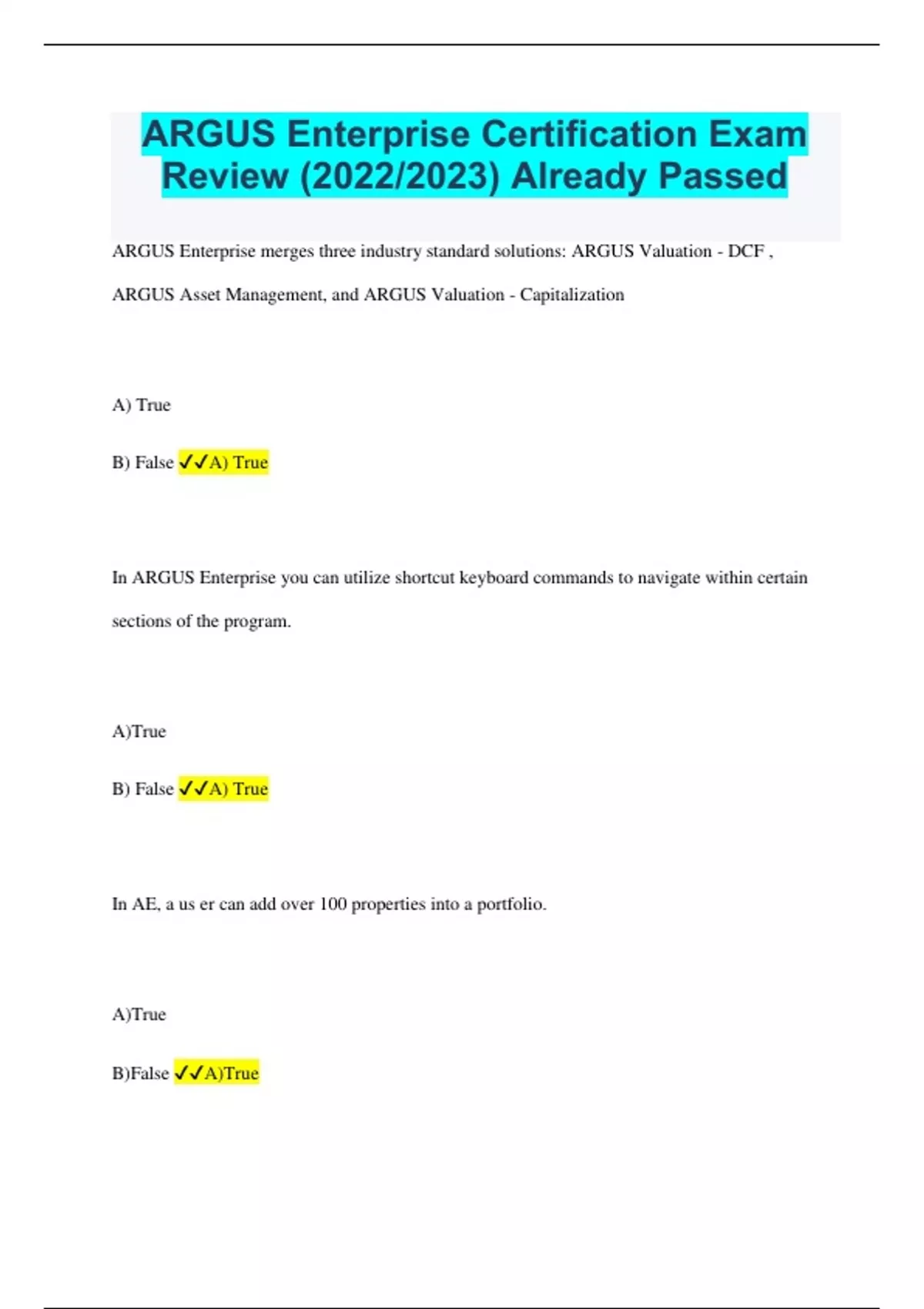 ARGUS Enterprise Certification Exam Review (2022/2023) Already Passed ARGUS Enterprise merges three industry standard solutions: ARGUS Valuation - DCF , ARGUS Asset Management, and ARGUS Valuation - Capitalization A) True B) False A) True In ARGUS Enterprise you can utilize shortcut keyboard commands to navigate within certain sections of the program. A)True B) False A) True In AE, a us er can add over 100 properties into a portfolio. A)True B)False A)True Which is a benefit to utilizing a Chart of Accounts? A) Easier to track Revenues/Expenses B) Standardizes portfolio for names of all Expenses/Revenues C) Helps with accounting system integration. D) All of the Above D) All of the Above In ARGUS Enterprise, you can only assign one Chart of Accounts to a Portfolio. A) True B) False A) True The Discard Changes option will discard only the last change you have made to the property record. A)True B)False B) False Only users with appropriate permissions can access all of the features in the Control Panel. A)True B) False A) True To lock down a specific property and restrict who can edit it, click the __________ button located in the ARGUS Enterprise Ribbon bar. A) Modeling Policies B) Calculate As C) Check out Property D) Details C) Check out property You can import and/or export v15 DCF files from ARGUS Enterprise. A) True B) False
