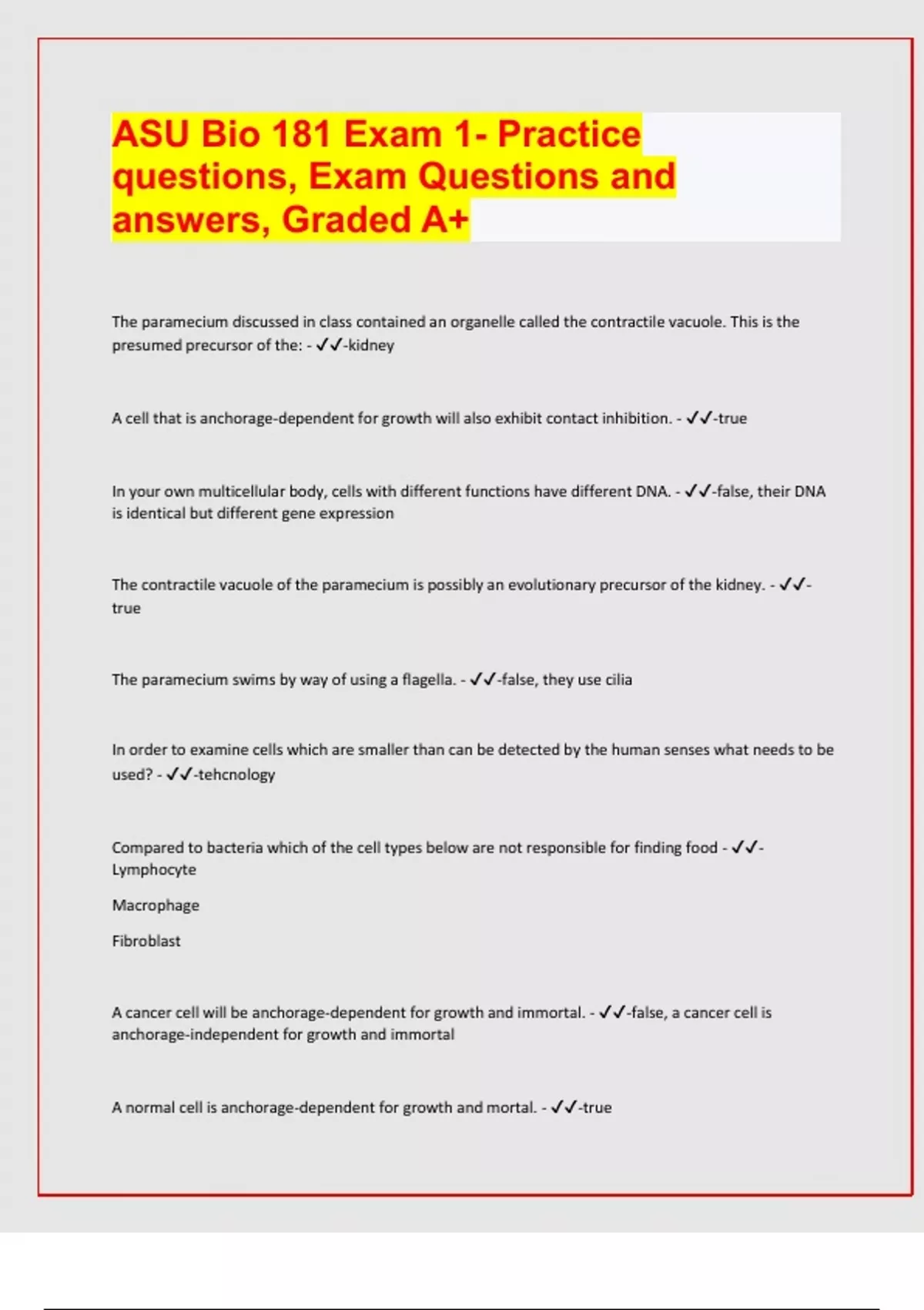 ASU Bio 181 Exam 1- Practice questions, Exam Questions and answers, Graded A+ The paramecium discussed in class contained an organelle called the contractile vacuole. This is the presumed precursor of the: - -kidney A cell that is anchorage-dependent for growth will also exhibit contact inhibition. - -true In your own multicellular body, cells with different functions have different DNA. - -false, their DNA is identical but different gene expression The contractile vacuole of the paramecium is possibly an evolutionary precursor of the kidney. - -true The paramecium swims by way of using a flagella. - -false, they use cilia In order to examine cells which are smaller than can be detected by the human senses what needs to be used? - -tehcnology Compared to bacteria which of the cell types below are not responsible for finding food - -Lymphocyte Macrophage Fibroblast A cancer cell will be anchorage-dependent for growth and immortal. - -false, a cancer cell is anchorage-independent for growth and immortal A normal cell is anchorage-dependent for growth and mortal. - -true A cell that is itself an organism must have a minimum of four needs presented in lecture. List these four things. - -a cell needs to find food, shelter, reproduce, and mate. Also be able to escape predators. In your own multicellular body, different cells in your body have a division of labor between them - -true What limits the paramecium from acquiring more complex functions? - -the number of biomolecular machines it can contain within itself Write a few sentences that explain what limits an individual cell from becoming more complex. - -It has a limited number of biomolecular machines that a cell can contain and limits it from being more complex. It has to do everything for itself. Also has a certain number of parts with which to change its engineering, thereby changing its function.