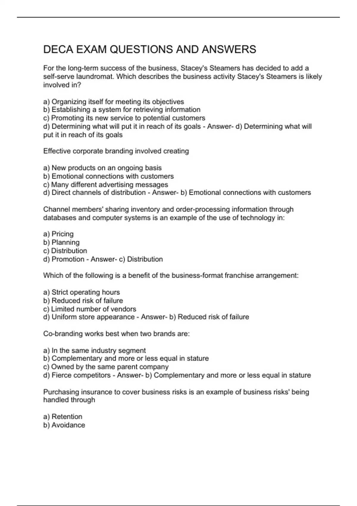 For the long-term success of the business, Stacey's Steamers has decided to add a self-serve laundromat. Which describes the business activity Stacey's Steamers is likely involved in? a) Organizing itself for meeting its objectives b) Establishing a system for retrieving information c) Promoting its new service to potential customers d) Determining what will put it in reach of its goals - Answer- d) Determining what will put it in reach of its goals Effective corporate branding involved creating a) New products on an ongoing basis b) Emotional connections with customers c) Many different advertising messages d) Direct channels of distribution - Answer- b) Emotional connections with customers Channel members' sharing inventory and order-processing information through databases and computer systems is an example of the use of technology in: a) Pricing b) Planning c) Distribution d) Promotion - Answer- c) Distribution Which of the following is a benefit of the business-format franchise arrangement: a) Strict operating hours b) Reduced risk of failure c) Limited number of vendors d) Uniform store appearance - Answer- b) Reduced risk of failure Co-branding works best when two brands are: a) In the same industry segment b) Complementary and more or less equal in stature c) Owned by the same parent company d) Fierce competitors - Answer- b) Complementary and more or less equal in stature Purchasing insurance to cover business risks is an example of business risks' being handled through