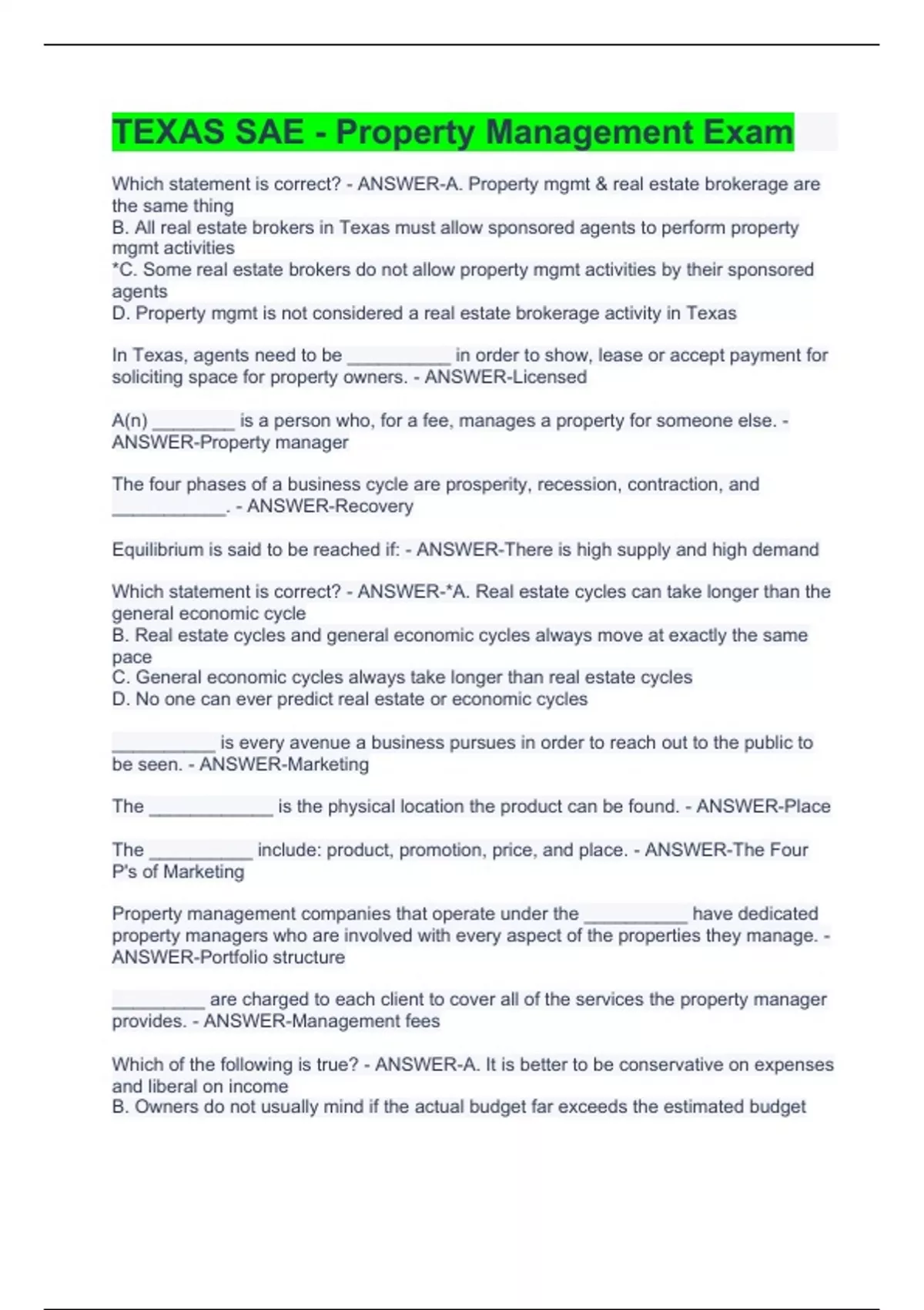 Which statement is correct? - ANSWER-A. Property mgmt & real estate brokerage are the same thing B. All real estate brokers in Texas must allow sponsored agents to perform property mgmt activities *C. Some real estate brokers do not allow property mgmt activities by their sponsored agents D. Property mgmt is not considered a real estate brokerage activity in Texas In Texas, agents need to be __________ in order to show, lease or accept payment for soliciting space for property owners. - ANSWER-Licensed A(n) ________ is a person who, for a fee, manages a property for someone else. - ANSWER-Property manager The four phases of a business cycle are prosperity, recession, contraction, and ___________. - ANSWER-Recovery Equilibrium is said to be reached if: - ANSWER-There is high supply and high demand Which statement is correct? - ANSWER-*A. Real estate cycles can take longer than the general economic cycle B. Real estate cycles and general economic cycles always move at exactly the same pace C. General economic cycles always take longer than real estate cycles D. No one can ever predict real estate or economic cycles __________ is every avenue a business pursues in order to reach out to the public to be seen. - ANSWER-Marketing The ____________ is the physical location the product can be found. - ANSWER-Place The __________ include: product, promotion, price, and place. - ANSWER-The Four P's of Marketing Property management companies that operate under the __________ have dedicated property managers who are involved with every aspect of the properties they manage. - ANSWER-Portfolio structure _________ are charged to each client to cover all of the services the property manager provides. - ANSWER-Management fees Which of the following is true? - ANSWER-A. It is better to be conservative on expenses and liberal on income B. Owners do not usually mind if the actual budget far exceeds the estimated budget