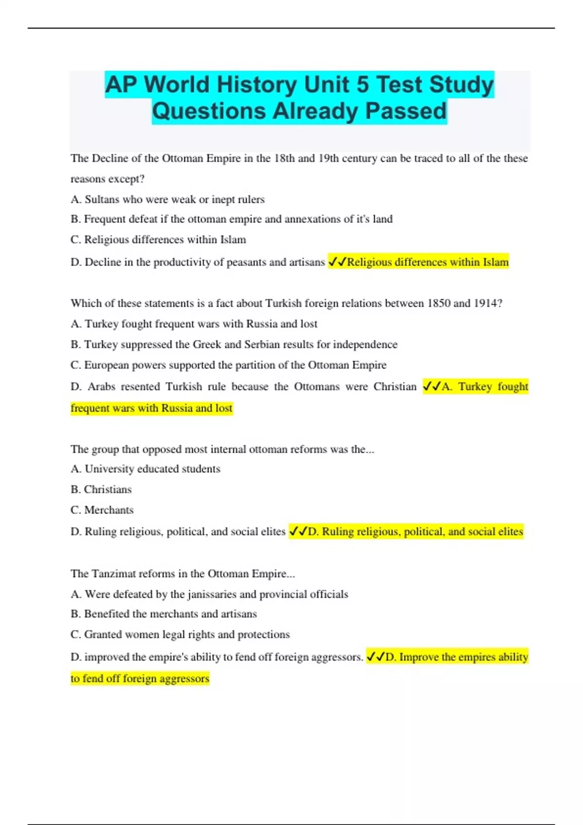 The Decline of the Ottoman Empire in the 18th and 19th century can be traced to all of the these reasons except? A. Sultans who were weak or inept rulers B. Frequent defeat if the ottoman empire and annexations of it's land C. Religious differences within Islam D. Decline in the productivity of peasants and artisans Religious differences within Islam Which of these statements is a fact about Turkish foreign relations between 1850 and 1914? A. Turkey fought frequent wars with Russia and lost B. Turkey suppressed the Greek and Serbian results for independence C. European powers supported the partition of the Ottoman Empire D. Arabs resented Turkish rule because the Ottomans were Christian A. Turkey fought frequent wars with Russia and lost The group that opposed most internal ottoman reforms was the... A. University educated students B. Christians C. Merchants D. Ruling religious, political, and social elites D. Ruling religious, political, and social elites The Tanzimat reforms in the Ottoman Empire... A. Were defeated by the janissaries and provincial officials B. Benefited the merchants and artisans C. Granted women legal rights and protections D. improved the empire's ability to fend off foreign aggressors. D. Improve the empires ability to fend off foreign aggressorsReforms under the late Ottoman sultans and young Turk leaders... A. Attempted to modernize turkey without westernizing B. Sought Muslim solutions to internal problems C. Emphasize westernization and copied western models open D. Were universally opposed by most members of Turkish society C. Emphasized westernization and copied western models open Mohammed Ali's attempts to reform in Egypt in the 19th century failed because... A. The powerful landlord class opposed them B. The peasants revolted C. The Europeans invaded Egypt and seized control D. He spent too much time attempting to conquer lands and failed to implement real reforms D. He spent too much time attempting to conquer lands and failed to implement real reforms The strategic importance of Egypt was changed by... A. Napoleons invasion in 1798 B. The khedives conquest of the middle east and defeat of the Ottoman Empire C. Building the Suez Canal D. The conversion of the majority of Egyptians to Christianity C. Building the Suez Canal The Muslim sudanese revolted under the Mahdi for all of these reasons except... A. Opposition to the British lead effort to end the slave trade B. The conquest of the Sudan by the British C. Opposition to British influence in the area D. A desire to purge Islam of Western influences D. The conquest of the Sudan by the British Although they were nomadic tribes it from me on the Great Wall, the Manchus, when they conquered China... A. freely settled among the Chinese people B. Reforms the main bureaucracy and removed local elites C. Emancipated women and peasantsD. Retained the Confucian gentry-scholars and much of the political system D. Retained the Confucian gentry-scholars and much of the political system Socially, the Manchu, (Qing) rulers... A. Encouraged innovative organizations such as the unions B. Reinforce much of the Confucian value system including the family C. Discouraged Manchu elites from adopting Chinese ways D. Refused to reinstate the Confucian testing system B. Reinforced much of the Confucian value system, including the family. The sector of the Chinese economy and society over which the wing rulers exercise the least control was the... A. Peasants B. Confucian scholars C. traditional landed elites D. Merchants and commercial interests D. Merchants and commercial interests All of these incidents were signs of the decline of the Qing Dynasty in China except the... A. Breakdown of honesty on the Chinese bureaucratic exams B. Divergent of taxes and revenues to enrich bureaucrats and their families C. Rise of the wealthy group of merchants D. Neglect of Public Works and utilities C. Rise of the wealthy group of merchants The British reverse there in balance of trade in the 18th century with China by... A. Selling opium to the Chinese B. Selling the Chinese British manufactured goods C. Negotiating treaties with the Chinese government D. Bartering the goods for Chinese luxury items A. Selling opium to the Chinese When the Chinese decided to end the illegal drug trade destroying their empire...A. Few Chinese supported the governments decision B. The Chinese successfully stopped the importation of the drug C. The British attacked China to protect their opium D. Many European nations defended the Chinese decision and supported them C. The British attacked China to protect their opium trade The most immediate result of the opium wars was... A. The partition of China between European nations B. The collapse of the QING dynasty and it's replacement C. The beginning of a powerful reform move