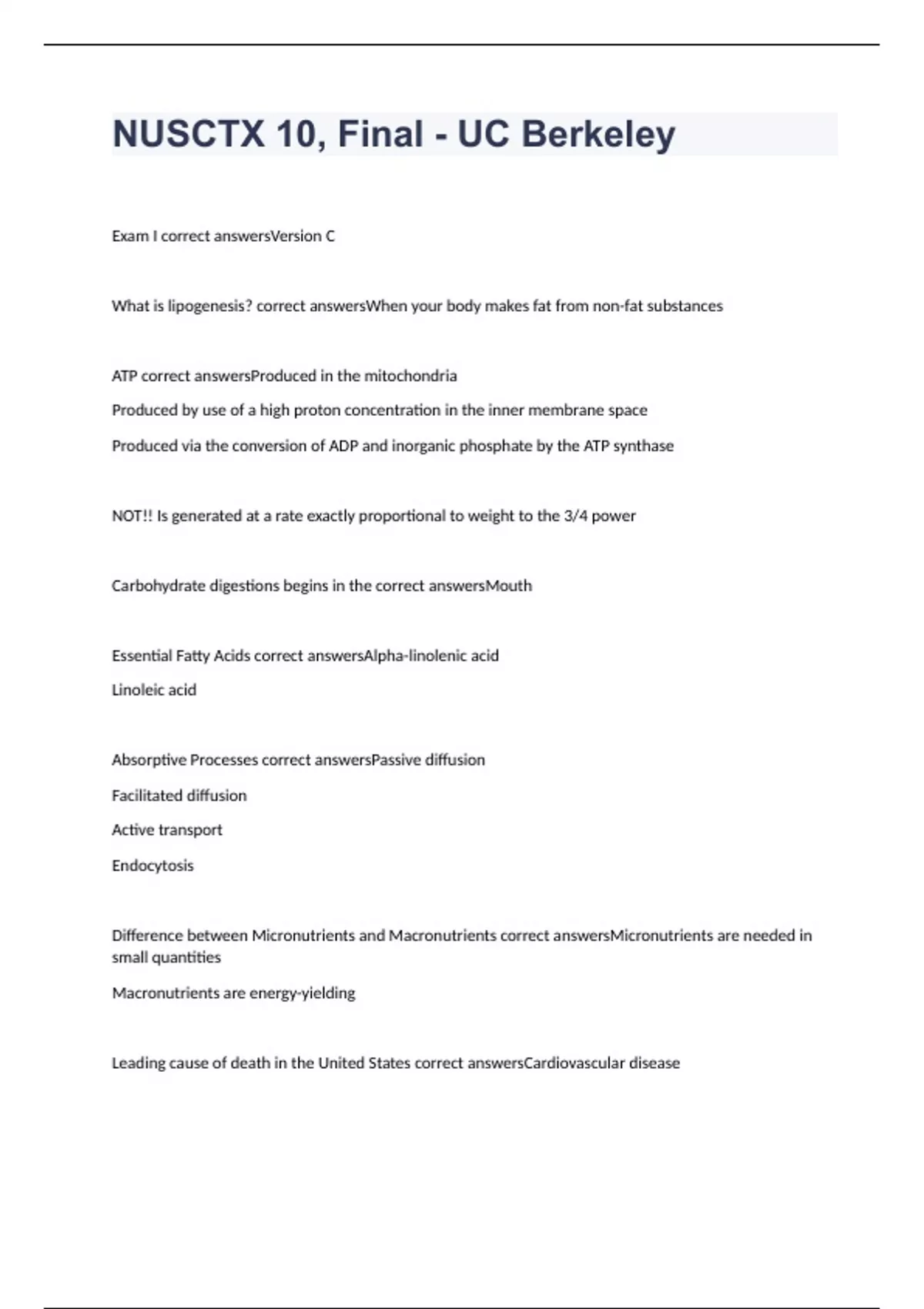 Exam I correct answersVersion C What is lipogenesis? correct answersWhen your body makes fat from non-fat substances ATP correct answersProduced in the mitochondria Produced by use of a high proton concentration in the inner membrane space Produced via the conversion of ADP and inorganic phosphate by the ATP synthase NOT!! Is generated at a rate exactly proportional to weight to the 3/4 power Carbohydrate digestions begins in the correct answersMouth Essential Fatty Acids correct answersAlpha-linolenic acid Linoleic acid Absorptive Processes correct answersPassive diffusion Facilitated diffusion Active transport Endocytosis Difference between Micronutrients and Macronutrients correct answersMicronutrients are needed in small quantities Macronutrients are energy-yielding Leading cause of death in the United States correct answersCardiovascular disease