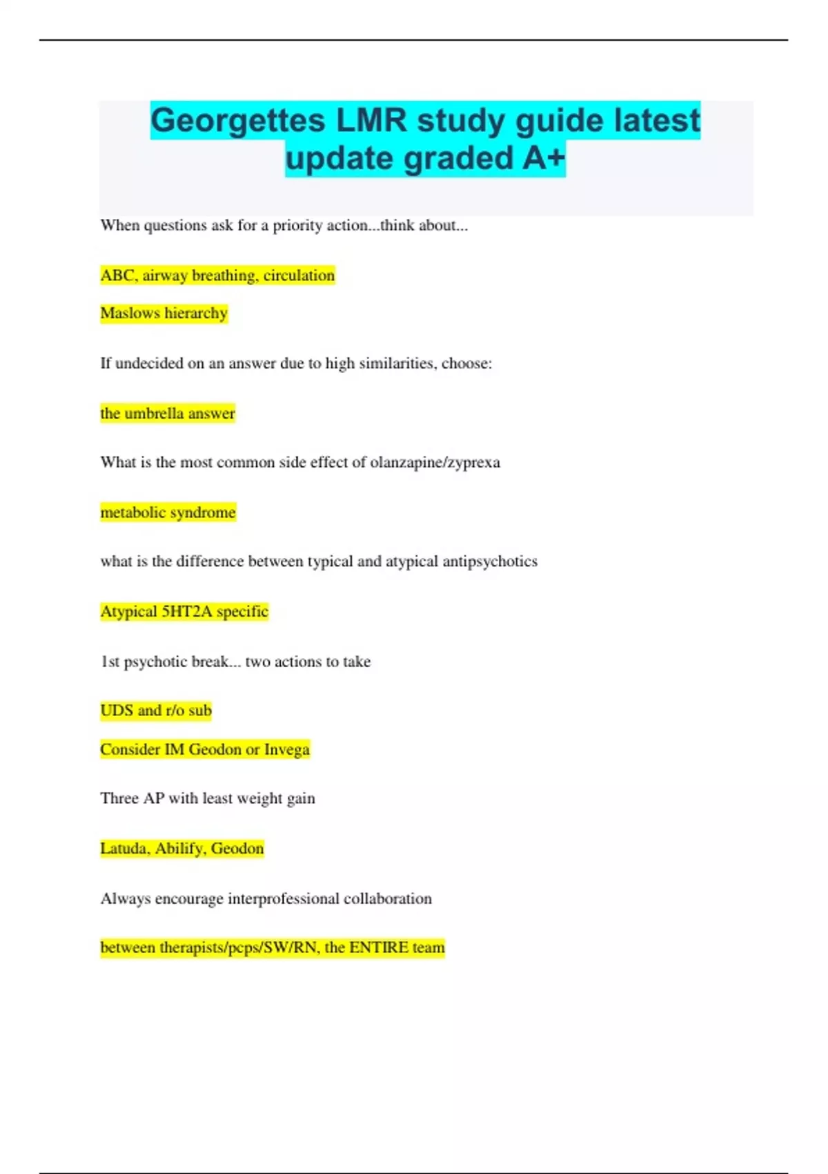 Georgettes LMR study guide latest update graded A+ When questions ask for a priority action...think about... ABC, airway breathing, circulation Maslows hierarchy If undecided on an answer due to high similarities, choose: the umbrella answer What is the most common side effect of olanzapine/zyprexa metabolic syndrome what is the difference between typical and atypical antipsychotics Atypical 5HT2A specific 1st psychotic break... two actions to take UDS and r/o sub Consider IM Geodon or Invega Three AP with least weight gain Latuda, Abilify, Geodon Always encourage interprofessional collaboration between therapists/pcps/SW/RN, the ENTIRE team TSH High, then....t3/t4 T3, T4 low TSH low, then...t3/t4 T3, T4 high cold/hot sensitivity with t3/t4 relationship T3/T4 low, hypothyroid, cold, slow T3/T4 high, hyperthyroid, hot, flushed, tachy What birth defect can be caused by depakote? Spina bifida What organ does depakote cause toxicity? and what sx would you expect to see? labs to run? Hepatotoxicity: RUQ pain, reddish brown urine- Do LFTs kava kava is used to treat anxiety and insomnia Rash and fever associated with tegretol, suspect What allele is HLAB 1502 associated? Asians. They CANNOT have tegretol. Test all asians for this allele. what rare and dangerous side effects are associated with tegretol Aplastic anemia Agranulocytosis-DC at ANC less than 1000 Sx's of agranulocytosis unusual bleeding or bruising, mouth sores, infections, fever, sore throat, fatigue if starting a woman on lithium what test should be done? why? HCG--risk of ebstein anomaly adverse s/e of lamictal/lamotrigine SJS labs to checke BEFORE starting on lithium BUN CRE urine protein What does
