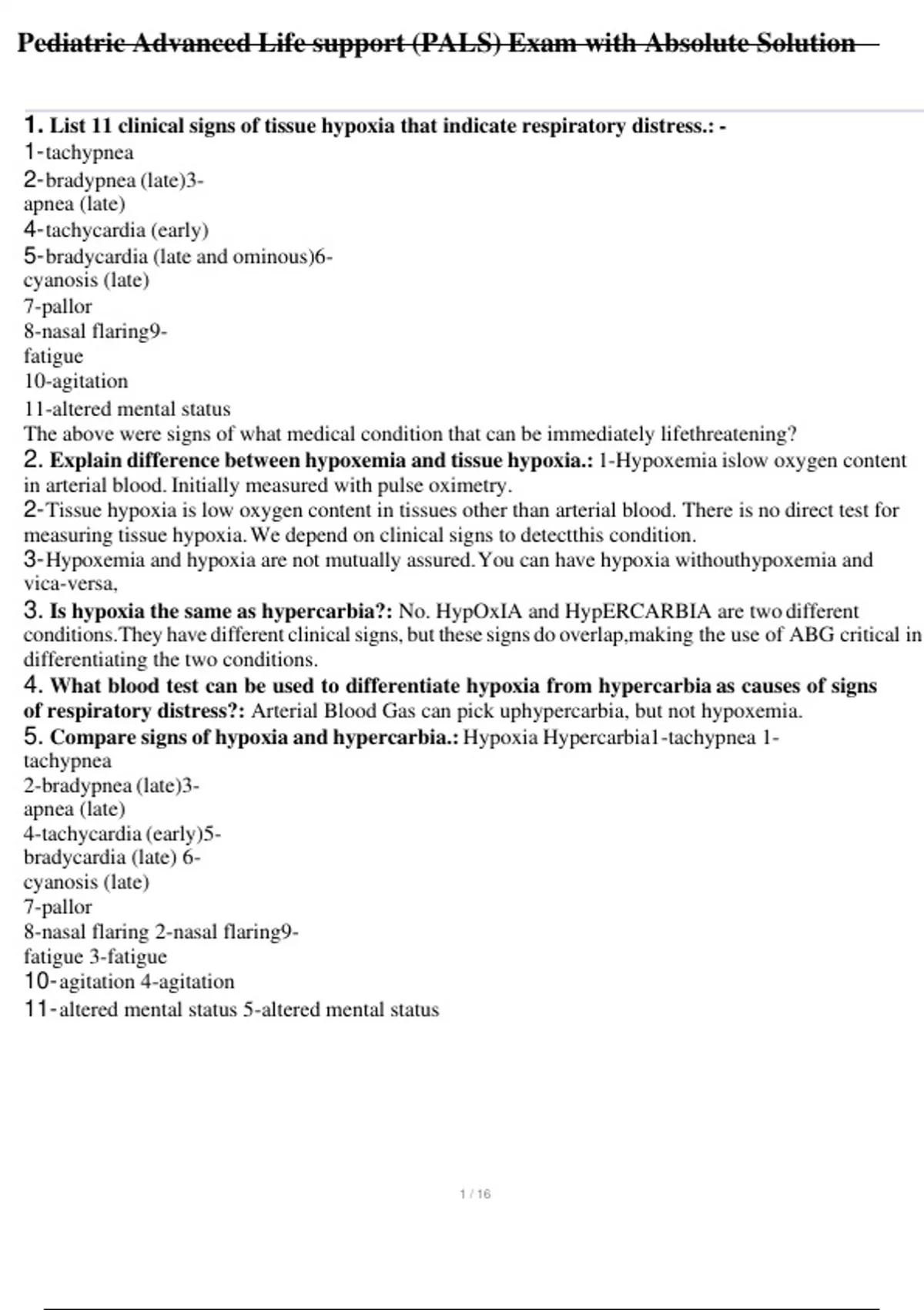 Pediatric Advanced Life support (PALS) Exam with Absolute Solution 1. List 11 clinical signs of tissue hypoxia that indicate respiratory distress.: - 1- tachypnea 2- bradypnea (late) 3-apnea (late) 4- tachycardia (early) 5- bradycardia (late and ominous) 6-cyanosis (late) 7-pallor 8-nasal flaring 9-fatigue 10-agitation 11-altered mental status The above were signs of what medical condition that can be immediately life threatening? 2. Explain difference between hypoxemia and tissue hypoxia.: 1-Hypoxemia is low oxygen content in arterial blood. Initially measured with pulse oximetry. 2- Tissue hypoxia is low oxygen content in tissues other than arterial blood. There is no direct test for measuring tissue hypoxia. We depend on clinical signs to detect this condition. 3- Hypoxemia and hypoxia are not mutually assured. You can have hypoxia without hypoxemia and vica-versa, 3. Is hypoxia the same as hypercarbia?: No. HypOxIA and HypERCARBIA are two different conditions. They have different clinical signs, but these signs do overlap, making the use of ABG critical in differentiating the two conditions. 4. What blood test can be used to differentiate hypoxia from hypercarbia as causes of signs of respiratory distress?: Arterial Blood Gas can pick up hypercarbia, but not hypoxemia. 5. Compare signs of hypoxia and hypercarbia.: Hypoxia Hypercarbia 1-tachypnea 1-tachypnea 2-bradypnea (late) 3-apnea (late) 4-tachycardia (early) 5-bradycardia (late) 6-cyanosis (late) 7-pallor 8-nasal flaring 2-nasal flaring 9-fatigue 3-fatigue 10- agitation 4-agitation 11- altered mental status 5-altered mental status 6. How is respiratory distress/failure categorized?: By severity (failure is more severe by definition than distress) By anatomic location of cause. 7. What are the possible anatomic sites causing respiratory distress?: 1-upper airway a-nose b-pharynx c-hypopharynx(=larynx) 2-lower airway a-trachea b-bronchi c-bronchioles 3-Lung tissue a-pneumonia b-pulmonary edema c-ARDS 4-Disordered respiratory control system a-CNS i-seizures ii-Central Nervous System infections iii-head injury iv-hydrocephalus v-brain tumor vi-neuromuscular disease 1)-myasthenia gravis 2)-Lou Gehrig's disease/Amyotrophic lateral sclerosis The above describe what? 8. Signs of upper airway obstruction (10)?: 1-tachypnea 2-increased respiratory effort 3- crying 4- change in voice ( hoarseness or "barky" cough) 5-stridor (usually inspiratory) 6- poor chest excursion (chest rise) 7- see-saw chest/abdominal motion on inspiration 8-poor air entry on auscultation 9- increased inspiratory respiratory effort ( inspiratory retractions, use of accessory muscles of respiration, nasal flaring) 10- drooling, snoring or gurgling sounds The above are signs of what condition or of what classification of cause of respiratory distress? 9. Signs of lower airway obstruction (6)?: 1-tachypnea 2-increased respiratory effort 3-wheezing (usually expiratory, but can be inspiratory) 4-coughing 5- prolonged expiratory phase 6- retractions, nasal flaring and prolonged expiration The above are signs of what classification of cause of respiratory distress? 10. Signs of lung tissue disease causing respiratory difficulty (7)?: 1-tachyp- nea 2-increased respiratory effort 3-diminished breath sounds 4-grunting 5- tachycardia 6- hypoxemia (despite administration of supplementary O2) 7-crackles (rales) and decreased air movement The above are signs of what classification of cause of respiratory distress? 11. Signs of disordered control of breathing (5)?: 1-Variable/irregular respiratory rate 2-Variable respiratory effort 3-Central apnea 4- Shallow breathing 5- normal or decreased air movement The above are signs of what classification of cause of respiratory distress? 12. Causes of upper airway obstruction?: 1-Croup 2-Anaphylaxis 3-FBO 4-tonsillar hypertrophy 5-epiglottis 6-pharyngeal or peritonsillar abscess, retropharyngeal abscess, or tumor 7-congenital airway abnormality( congenital subglottic stenosis) 13. Treatment of respiratory distress due to croup?: Mild croup 1-cool mist+oxygen 2-dexamethasone (0.6 mg/kg IM, not to exceed 10 mg) Mod.-Severe 1- cool mist+oxygen 2- dexamethasone (0.6 mg/kg IM, not to exceed 10 mg) or nebulized 3-L -epinephrine (1:1000) nebulized has proven to significantly reduce croup symp- toms 30 minutes after treatment. 4- Nebulized budesonide (2 mg) 5- Inhaled Decadron when budesonide unavailable 6-NPO Severe 1-6 above 7-Intubate 8-ventillate The above are current therapies for ? 14. Treatment of respiratory distress due to anaphylaxis?: 1-epinephrine 0.01 mg/kg IM or IV 2-Albuterol for wheezing MDI cont. nebulizer 3-benadryl Pediatric Dosage: 2-5 mg/kg. Adult Dosage: 25-50 mg. Routes: Slow IV push or deep IM. 4- H2blocker Zantac (ranitidine) Bolus IV: 50 mg IV q6-8h Continuous IV: 6.25 mg/h IV Oral Dosing: 150 mg PO bid Pepcid (famotidine) Oral dosing: 20 to 40 mg PO bid Tagamet (cimetidine) Bolus parenteral dosing: 300 mg IV or IM q6h Continuous IV Dosing: 37.5 mg/h IV Oral Dosing: 400 mg PO bid 5- methylprednisolone (SoluMedrol) 6- Trendelenburg+IV epi titrate+IV isotonic crystalloid 20 ml/kg 15. 1-Formula for calculating "Arterial Oxygen Content" (AOC)? 2-What clinical tests/observations are needed to be able to calculate AOC?: 1) AOC=[1.36 x Hgb conc. X SpO2]+[0.003xPaO2] 2) CBC, pulse oximetry, ABG 16. What clinical and laboratory measurable parameters do you need to be able to calculate the Arterial Oxygen Content?: 1-serum Hgb concentration (obtained from CBC) in units of g/dL 2- SpO2=Saturation pulse oxygen (Pulse ox machine reading) in units of % 3- PaO2=Partial pressure arterial oxygen (obtained from arterial blood gas test) in units of mm HG 17. What are 5 environmental or patient physiologic factors that can cause hypoxemia?: 1-low ambient PO2 2-Alveolar hypoventilation 3-Diffusion defect 4-Vent./Perfusion (V/Q) imbalance 5-Shunt 18. Mechanism by which causes hypoxemia? 1-Low ambient PO2 2-Alveolar hypoventilation 3-Diffusion d