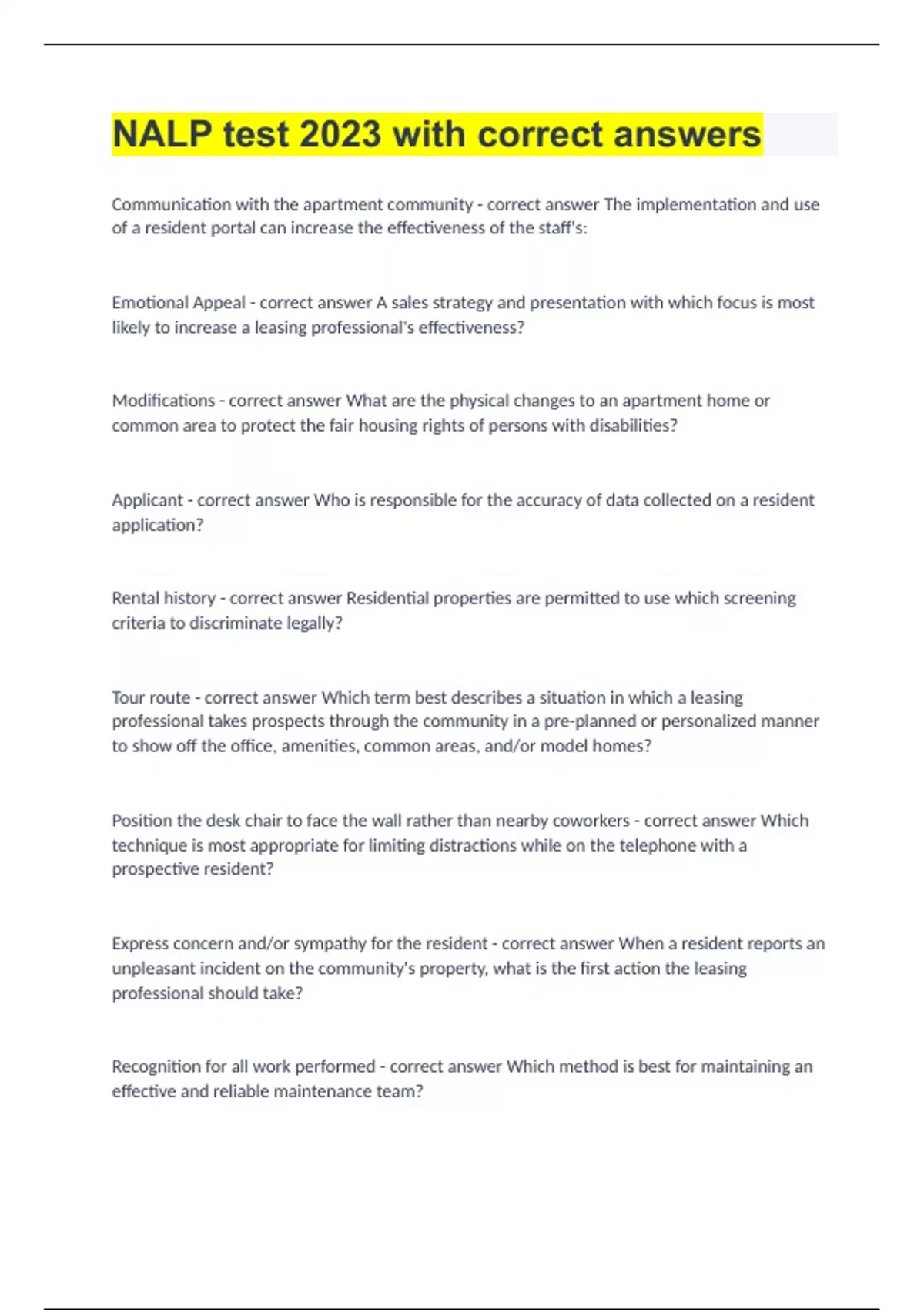 Communication with the apartment community The implementation and use of a resident portal can increase the effectiveness of the staff's: Emotional Appeal A sales strategy and presentation with which focus is most likely to increase a leasing professional's effectiveness? Modifications What are the physical changes to an apartment home or common area to protect the fair housing rights of persons with disabilities? Applicant Who is responsible for the accuracy of data collected on a resident application? Rental history Residential properties are permitted to use which screening criteria to discriminate legally? Tour route Which term best describes a situation in which a leasing professional takes prospects through the community in a pre-planned or personalized manner to show off the office, amenities, common areas, and/or model homes? Position the desk chair to face the wall rather than nearby coworkers Which technique is most appropriate for limiting distractions while on the telephone with a prospective resident? Express concern and/or sympathy for the resident When a resident reports an unpleasant incident on the community's property, what is the first action the leasing professional should take? Recognition for all work performed Which method is best for maintaining an effective and reliable maintenance team? Has different impacts on persons of certain protected classes Discrimination due to disparate impact means that a policy or procedure Maintenance office All of the following are part of an apartment community's curb appeal except the Features and benefits The key to a good sales presentation is to match the prospects's wants and needs to the community's The source of the lead Which piece of information is critical for the leasing professional to inquire about when greeting a prospective resident? Engage in mystery shopping at competing properties Which is the best way for leasing professionals to learn what their community's competing properties are offering? Needs and interests of the prospective resident An emotionally appealing sales technique typically involves connecting the features and qualities of the apartment community with the: High-quality preventative maintenance services Which aspect of an apartment community typically offers the residents the greatest continuing value? Physical and mental Which two types of impairments are generally considered disabilities? National origin Which of the following classes is protected from discrimination by fair housing laws? What brought you in to our community today Which question is open-ended? A feature is an item or an amenity; a benefit is what the feature does for a resident What is the difference between a feature and a benefit? Accommodation What are the changes made to community policies and/or procedures to protect the fair housing rights of a person with disabilities? Personalized approaches and emotional appeals Which is the best characterization of relationship selling? Respond to all comments Which strategy is most appropriate for managing an apartment community's online reputation What date are you hoping to move in? Which question is closed-ended? Obtain factual information from a person It is most appropriate for a leasing professional to ask closed-ended question when trying to: Assess, present, and close What are the three keys steps in the relationship-sales process? Admit it, explain it, and resolve it What is the three step process to manage objections? Respond to the immediately How can a leasing professional best increase the chances of turning an inbound lead into a successful visit? Ensuring that information provided by applicants is truthful All of the following tasks are key functions of the leasing professionals role except Personally contact the resident and attempt to retract the notice What should be a leasing professionals first response after receiving a notice to vacate from a community resident? Effective communication Community staff members who exhibit which characteristic are most likely to ensure that residents are provided the best possible service with the fewest misunderstandings? Needs, wants, and qualifying characteristics A leasing professional who has a firm understanding of the community's resident profile will be able to conclude which information about the typical resident? The services at the property that were used and valued When engaging residents in discussion while persuading them to renew, which topic would be most useful to discuss? Display positive feedback from past, prospective, and current residents How can a leasing professional best persuade prospective residents that the apartment community is a trusted brand? To gain a firm commitment from the prospective resident before moving to the next step Why should closing occur at each step of the sales process? On-site testers Leasing professionals should be aware that the compliance with the fair housing act is being verified through which governmental mechanism? Monument, directional, and facility signage The best way for an apartment community to continually inform and market to prospective residents is to provide: