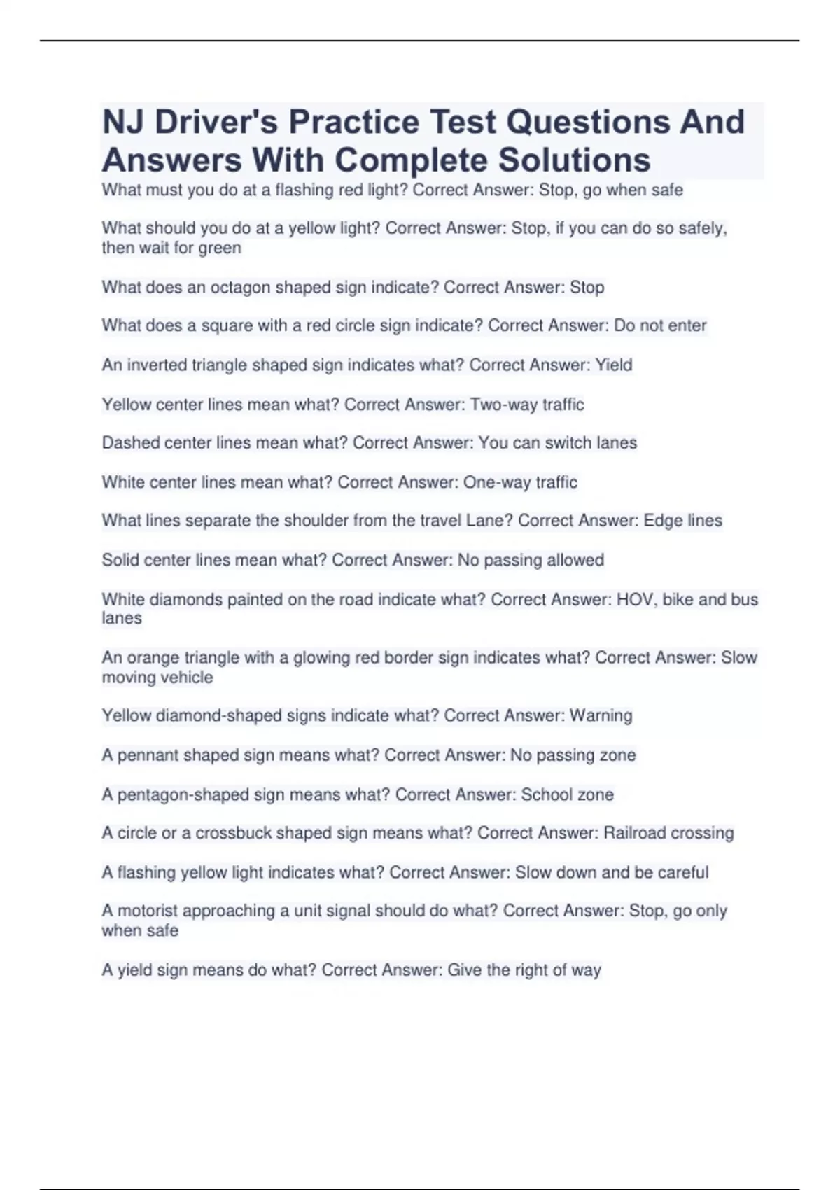 NJ Driver's Practice Test Questions And Answers With Complete Solutions What must you do at a flashing red light? Correct Answer: Stop, go when safe What should you do at a yellow light? Correct Answer: Stop, if you can do so safely, then wait for green What does an octagon shaped sign indicate? Correct Answer: Stop What does a square with a red circle sign indicate? Correct Answer: Do not enter An inverted triangle shaped sign indicates what? Correct Answer: Yield Yellow center lines mean what? Correct Answer: Two-way traffic Dashed center lines mean what? Correct Answer: You can switch lanes
