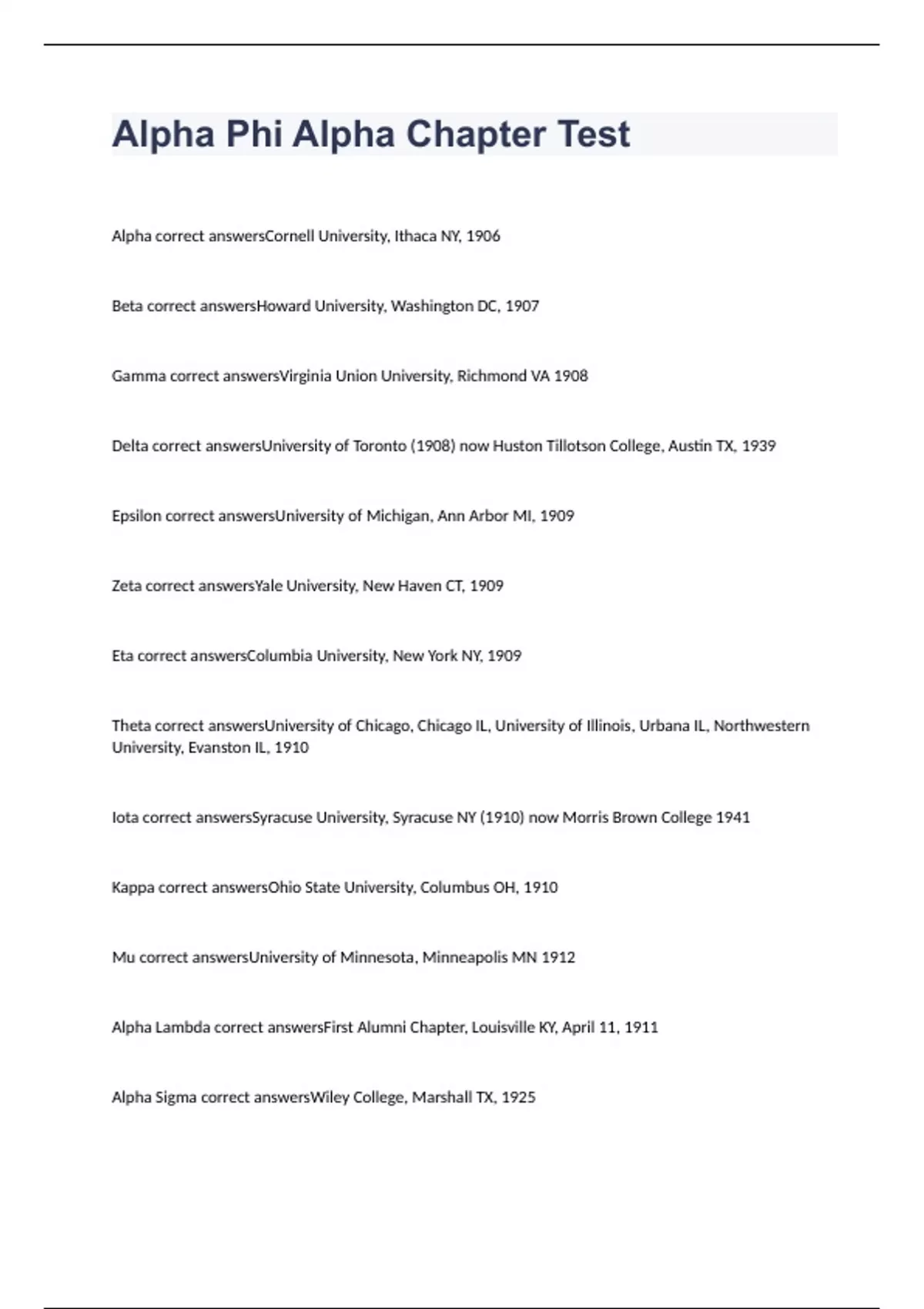 Alpha correct answersCornell University, Ithaca NY, 1906 Beta correct answersHoward University, Washington DC, 1907 Gamma correct answersVirginia Union University, Richmond VA 1908 Delta correct answersUniversity of Toronto (1908) now Huston Tillotson College, Austin TX, 1939 Epsilon correct answersUniversity of Michigan, Ann Arbor MI, 1909 Zeta correct answersYale University, New Haven CT, 1909 Eta correct answersColumbia University, New York NY, 1909 Theta correct answersUniversity of Chicago, Chicago IL, University of Illinois, Urbana IL, Northwestern University, Evanston IL, 1910 Iota correct answersSyracuse University, Syracuse NY (1910) now Morris Brown College 1941 Kappa correct answersOhio State University, Columbus OH, 1910 Mu correct answersUniversity of Minnesota, Minneapolis MN 1912 Alpha Lambda correct answersFirst Alumni Chapter, Louisville KY, April 11, 1911 Alpha Sigma correct answersWiley College, Marshall TX, 1925