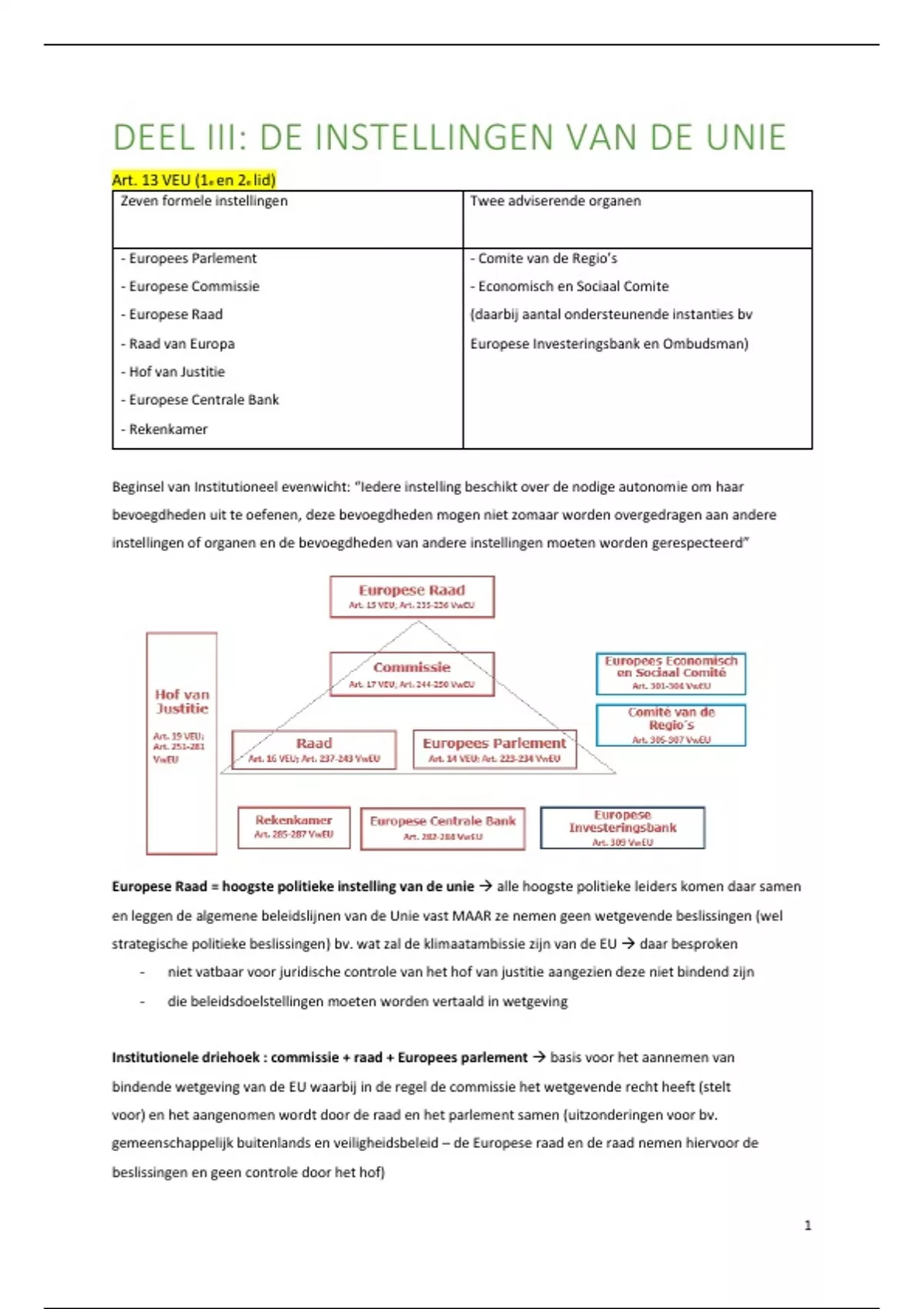 Europese Raad = hoogste politieke instelling van de unie → alle hoogste politieke leiders komen daar samen