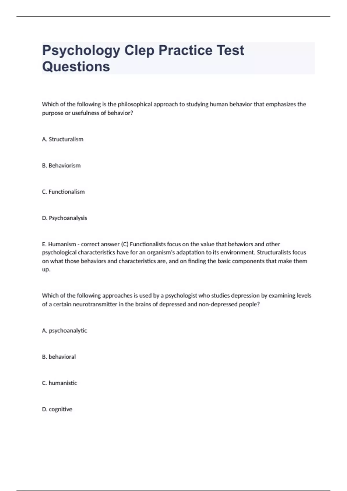 Psychology Clep Practice Test QuestionsWhich of the following is the philosophical approach to studying human behavior that emphasizes the purpose or usefulness of behavior? A. Structuralism B. Behaviorism C. Functionalism D. Psychoanalysis E. Humanism - correct answer (C) Functionalists focus on the value that behaviors and other psychological characteristics have for an organism's adaptation to its environment. Structuralists focus on what those behaviors and characteristics are, and on finding the basic components that make them up. Which of the following approaches is used by a psychologist who studies depression by examining levels of a certain neurotransmitter in the brains of depressed and non-depressed people? A. psychoanalytic B. behavioral C. humanistic D. cognitive