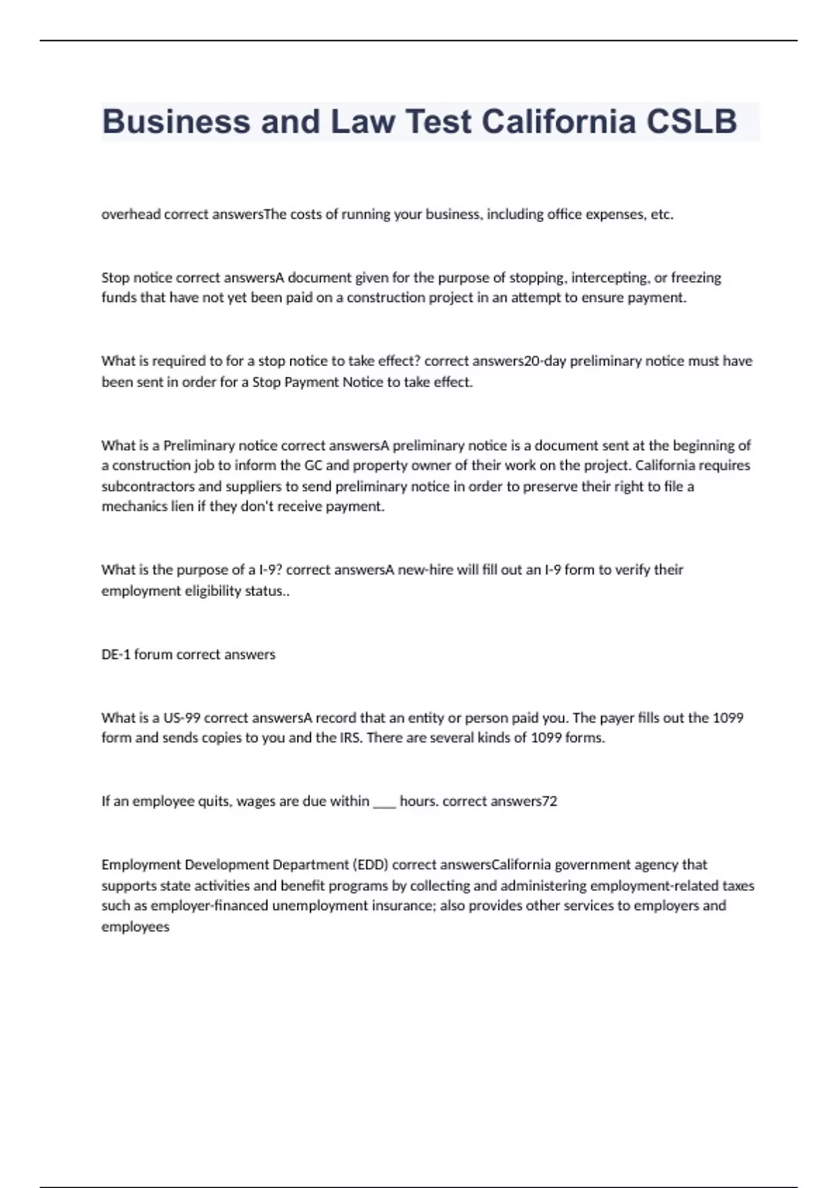 overhead correct answersThe costs of running your business, including office expenses, etc. Stop notice correct answersA document given for the purpose of stopping, intercepting, or freezing funds that have not yet been paid on a construction project in an attempt to ensure payment. What is required to for a stop notice to take effect? correct answers20-day preliminary notice must have been sent in order for a Stop Payment Notice to take effect. What is a Preliminary notice correct answersA preliminary notice is a document sent at the beginning of a construction job to inform the GC and property owner of their work on the project. California requires subcontractors and suppliers to send preliminary notice in order to preserve their right to file a mechanics lien if they don't receive payment. What is the purpose of a I-9? correct answersA new-hire will fill out an I-9 form to verify their employment eligibility status.. DE-1 forum correct answers What is a US-99 correct answersA record that an entity or person paid you. The payer fills out the 1099 form and sends copies to you and the IRS. There are several kinds of 1099 forms. If an employee quits, wages are due within ___ hours. correct answers72 Employment Development Department (EDD) correct answersCalifornia government agency that supports state activities and benefit programs by collecting and administering employment-related taxes such as employer-financed unemployment insurance; also provides other services to employers and employees