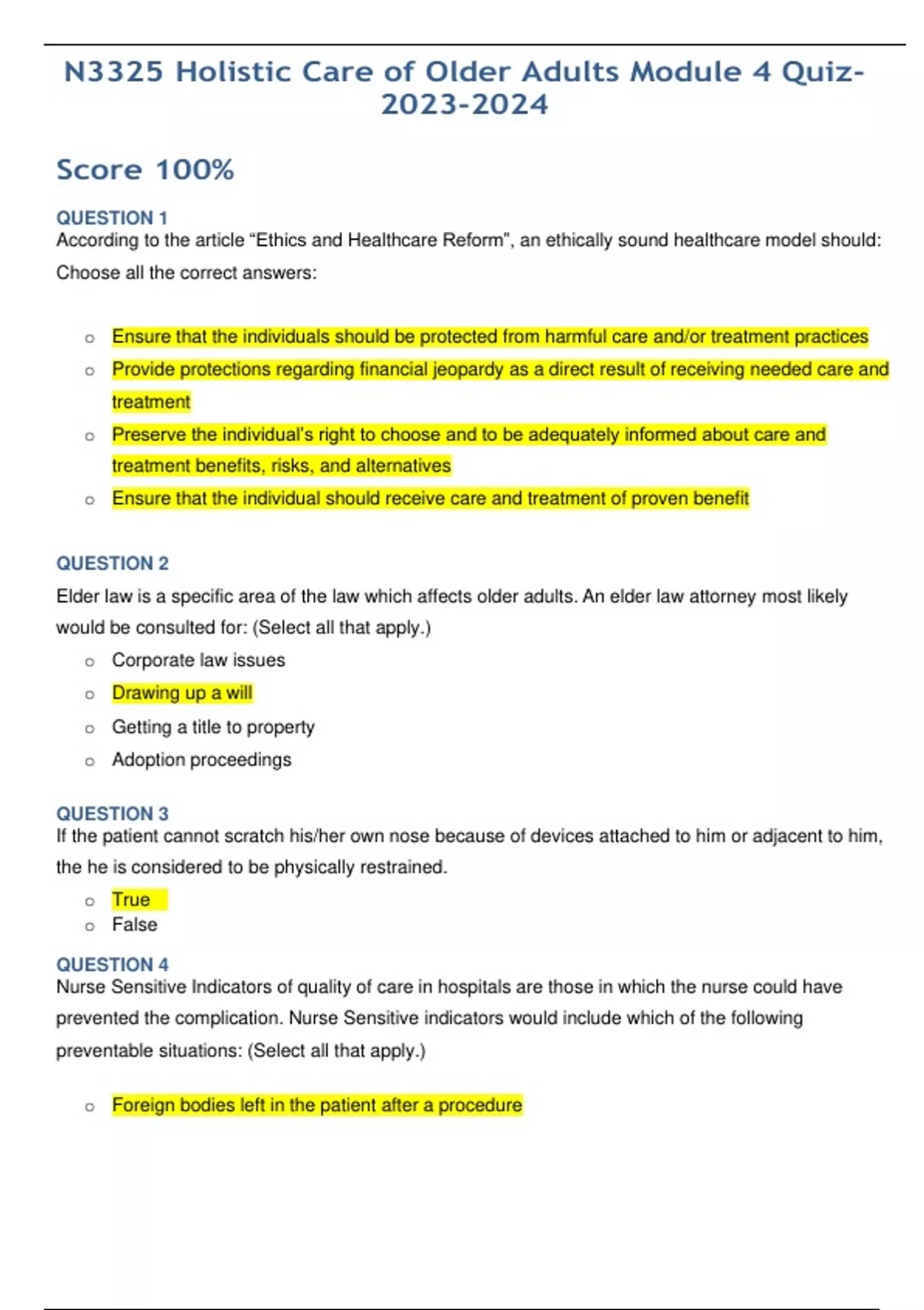 N3325 Holistic Care of Older Adults Module 4 Quiz-