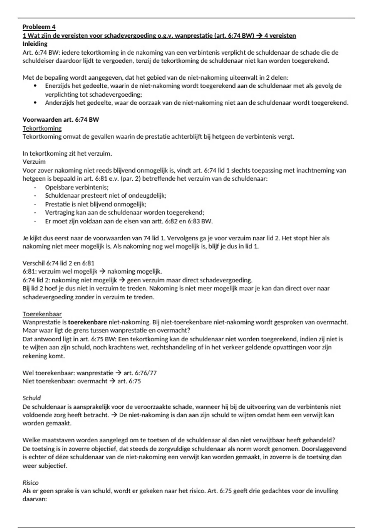 1 Wat zijn de vereisten voor schadevergoeding o.g.v. wanprestatie (art. 6:74 BW)  4 vereisten