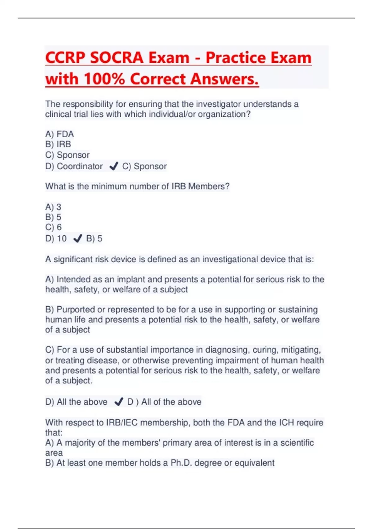 CCRP SOCRA Exam - Practice Exam with 100% Correct Answers | Latest 2023/2024 The responsibility for ensuring that the investigator understands a clinical trial lies with which individual/or organization? A) FDA B) IRB C) Sponsor D) Coordinator ️ C) Sponsor What is the minimum number of IRB Members? A) 3 B) 5 C) 6 D) 10 ️ B) 5 A significant risk device is defined as an investigational device that is: A) Intended as an implant and presents a potential for serious risk to the health, safety, or welfare of a subject B) Purported or represented to be for a use in supporting or sustaining human life and presents a potential risk to the health, safety, or welfare of a subject C) For a use of substantial importance in diagnosing, curing, mitigating, or treating disease, or otherwise preventing impairment of human health and presents a potential for serious risk to the health, safety, or welfare of a subject. D) All the above ️ D ) All of the above With respect to IRB/IEC membership, both the FDA and the ICH require that: A) A majority of the members' primary area of interest is in a scientific area B) At least one member holds a Ph.D. degree or equivalent