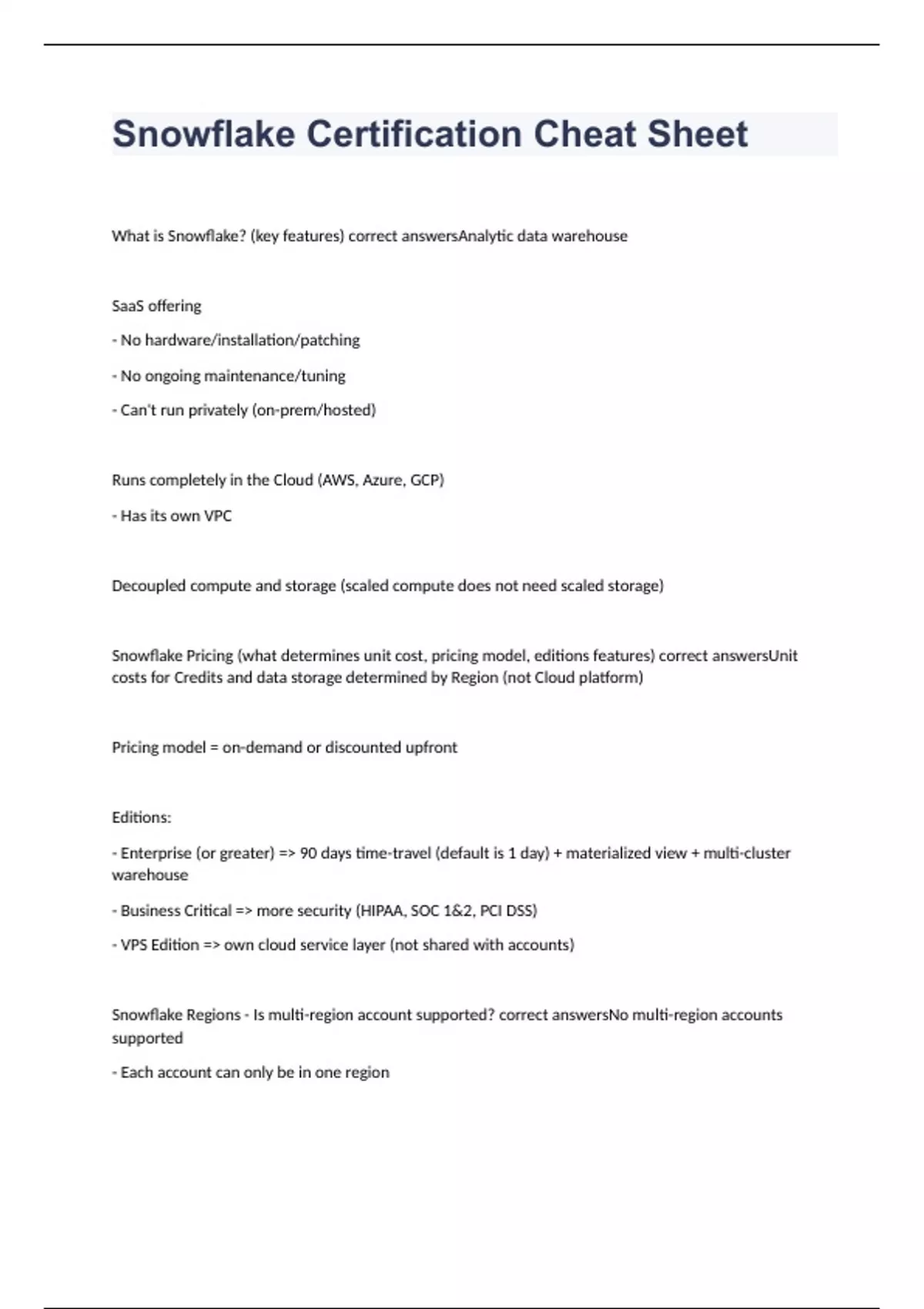 What is Snowflake? (key features) correct answersAnalytic data warehouse SaaS offering - No hardware/installation/patching - No ongoing maintenance/tuning - Can't run privately (on-prem/hosted) Runs completely in the Cloud (AWS, Azure, GCP) - Has its own VPC Decoupled compute and storage (scaled compute does not need scaled storage) Snowflake Pricing (what determines unit cost, pricing model, editions features) correct answersUnit costs for Credits and data storage determined by Region (not Cloud platform) Pricing model = on-demand or discounted upfront Editions: - Enterprise (or greater) => 90 days time-travel (default is 1 day) + materialized view + multi-cluster warehouse - Business Critical => more security (HIPAA, SOC 1&2, PCI DSS) - VPS Edition => own cloud service layer (not shared with accounts) Snowflake Regions - Is multi-region account supported? correct answersNo multi-region accounts supported - Each account can only be in one region