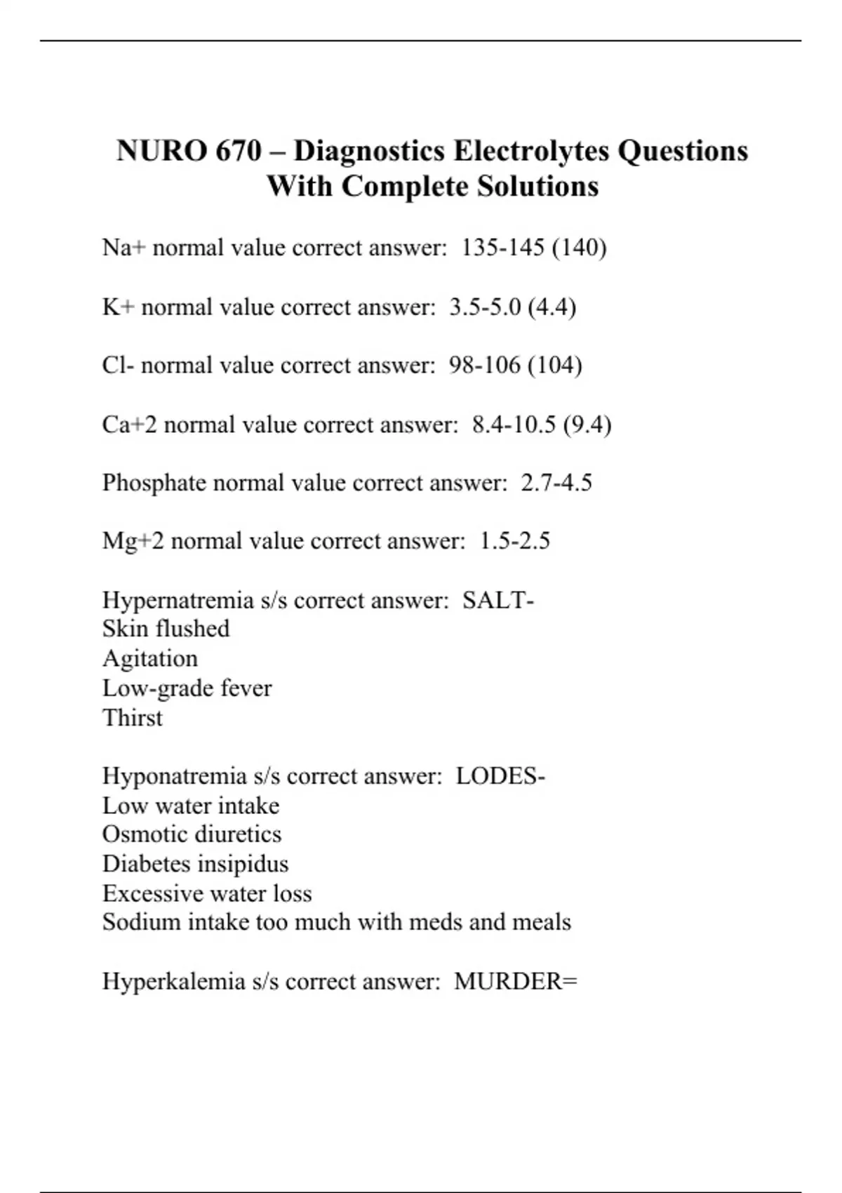 NURO 670 – Diagnostics Electrolytes Questions With Complete Solutions