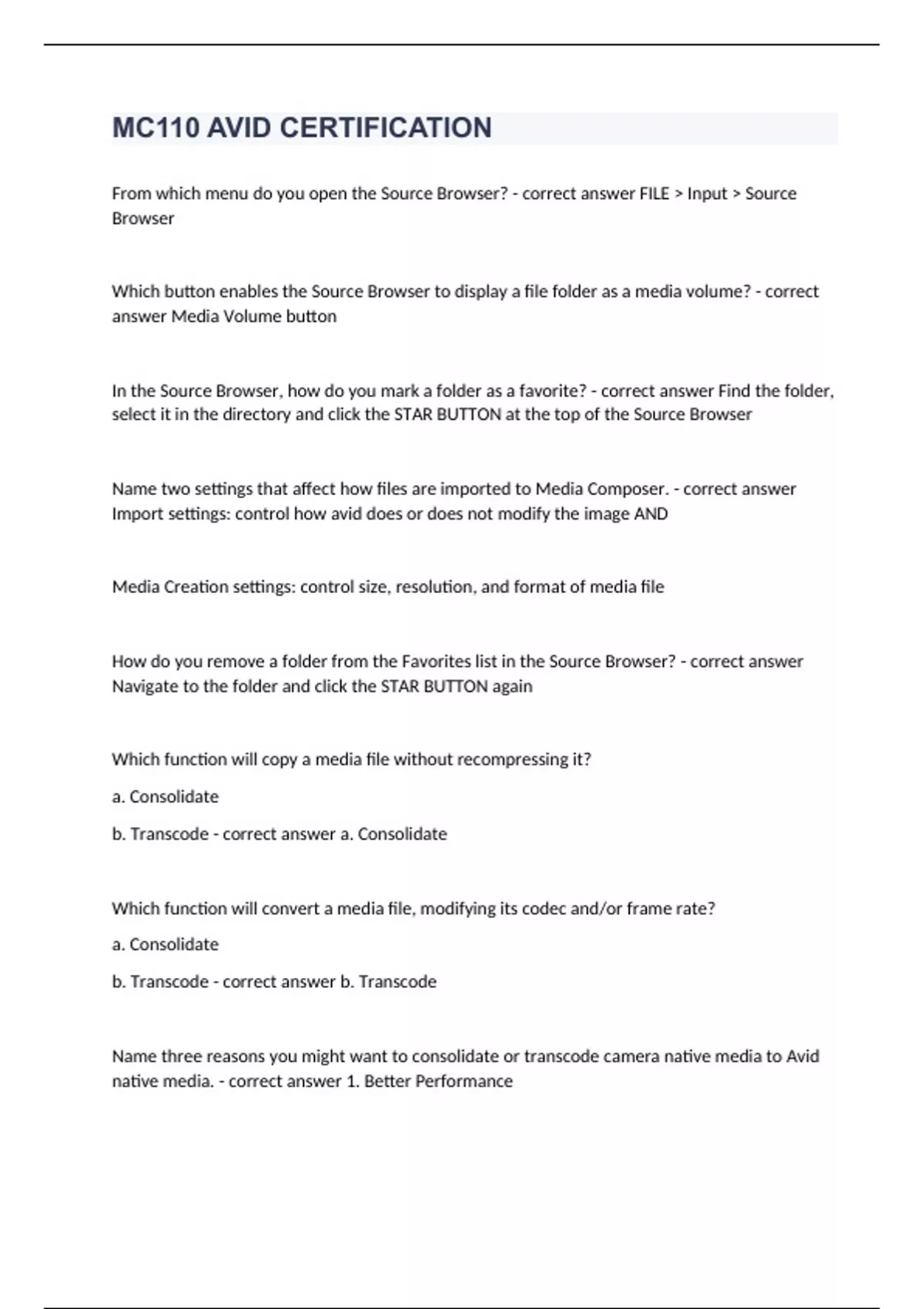 From which menu do you open the Source Browser? - correct answer FILE > Input > Source Browser Which button enables the Source Browser to display a file folder as a media volume? - correct answer Media Volume button In the Source Browser, how do you mark a folder as a favorite? - correct answer Find the folder, select it in the directory and click the STAR BUTTON at the top of the Source Browser Name two settings that affect how files are imported to Media Composer. - correct answer Import settings: control how avid does or does not modify the image AND Media Creation settings: control size, resolution, and format of media file How do you remove a folder from the Favorites list in the Source Browser? - correct answer Navigate to the folder and click the STAR BUTTON again Which function will copy a media file without recompressing it? a. Consolidate b. Transcode - correct answer a. Consolidate Which function will convert a media file, modifying its codec and/or frame rate? a. Consolidate b. Transcode - correct answer b. Transcode Name three reasons you might want to consolidate or transcode camera native media to Avid native media. - correct answer 1. Better Performance 2. Easier Media Management 3. Better Workflow Which setting will resize a large photograph during import to avoid distorting it? a. Resize Image to Fit Format Raster b. Crop/Pad for DV Scan Line Difference c. Do Not Resize Smaller Images d. Image Sized for Current Format - correct answer a. Resize Image to Fit Format Raster What is a subclip? How do you create one? What does its icon look like? - correct answer • Used to divide portions of one clip into shorter clips • Load a clip into the Source Monitor, Mark IN & OUT points, Drag to Bin & Rename • Icon: half of a frame from a film strip Why would you create a subclip? - correct answer • To isolate important sound bites from an interview • To separate good cutaway shots • To separate clean room tone • To separate individual takes (if the director resets for another take without stopping the camera) How can you access a master clip from another project? - correct answer File> Open Bin > Navigate & Select Bin > Choose Master Clip Where do bins opened from other projects appear? - correct answer Other Bins Folder Why might you need to sync audio and video master clips? - correct answer Audio and video will need to be synced if you used dual system sound (audio and video recorded on different systems) List the steps to sync audio and video master clips. What is the result of this process? - correct answer 1. Copy the clips to be synced to a new bin for syncing 2. Mark IN points, Mark OUT points, Be sure the Timecode matches, OR if Waveform Analysis (no need to do anything) 3. Clip > AutoSync 4. Choose the method you want to use to sync the clips 5. Click OK You have audio and video master clips that do not have a common timecode reference. Is it possible to sync these clips? If so, how? - correct answer Yes. Mark IN point in the audio at slate clap and an IN point in the video where the slate closes, then AutoSync by IN points You have audio and video master clips that do not have a common timecode reference or a clapper board but have audio on both. Is it possible to sync these clips? If so, how? - correct answer Yes. Select both clips and AutoSync with Waveform Analysis What is a group clip? What is the advantage of working with group clips? - correct answer • A single set of master clips grouped by source timecode, auxiliary timecode, marks placed in footage, or waveform syncing • Multicam: Gives the Editor the convenience of being able to load a single item from the bin and have simultaneous access to all camera angles and the freedom to switch between them on the fly What is the keyboard shortcut for grouping clips? - correct answer Ctrl + Shift + G How do you display the start timecode of your clips? - correct answer In the Bin, click Fast Menu > Choose Columns How do you add a custom column to a bin in Text view? - correct answer Right-Click on Bin heading > Add Custom Column What is the shortcut to view a pop-up menu containing previously entered values in a custom column? - correct answer Alt + click the column box What is the difference between duplicating a clip and cloning a clip? - correct answer Duplicate: new copy, independent of the original Clone: same item with metadata, linked to the original If editing a group of clips to the sequence from the bin in Text view, what controls the order in which the clips will appear in the sequence? - correct answer Sorting them in the bin by column (top to down) If editing a group of clips to the sequence from the bin in Frame view, what controls the order in which the clips will appear in the sequence? - correct answer How they're sorted in the bin (left to right, top to down) How do you clear all marks from a clip or a group of clips? - correct answer G Which type of edit is most similar to Top or Tail? a. Splice-In b. Overwrite c. Lift d. Extract e. Extend - correct answer d. Extract How is Extend similar to Trim? More specifically, what type of trim? - correct answer Both add content; Dual Roller Trim Name three uses of markers. - correct answer 1. Marking the location of good bites in an interview 2. Providing the correct spelling for titles 3. Identifying shots that will be added later 4. Marking the location to add music cues or sound effects 5. Including notes for a producer, colorist, audio mixer, or graphic artist 6. Identifying remaining tasks; when all markers are gone, it means you have made all necessary changes to an edit What tool enables you to remap command buttons? - correct answer Command Palette (Button to Button Reassignment) Which two windows must be open to change the keyboard settings? - correct answer Command Palette & Keyboard Settings (File > Settings > User > Keyboard) How many edit points are required to define an edit when adding a shot to a sequence? - correct answer 3 True