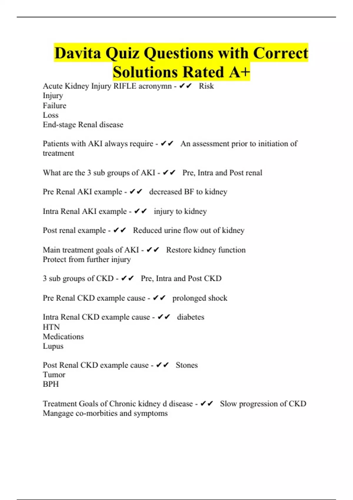 Davita Quiz Questions with Correct Solutions Rated A+
