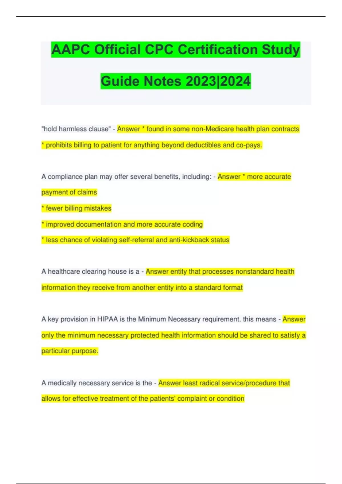 AAPC Official CPC Certification Study Guide Notes 2023|2024 "hold harmless clause" - Answer * found in some non-Medicare health plan contracts * prohibits billing to patient for anything beyond deductibles and co-pays. A compliance plan may offer several benefits, including: - Answer * more accurate payment of claims * fewer billing mistakes * improved documentation and more accurate coding * less chance of violating self-referral and anti-kickback status A healthcare clearing house is a - Answer entity that processes nonstandard health information they receive from another entity into a standard format A key provision in HIPAA is the Minimum Necessary requirement. this means - Answer only the minimum necessary protected health information should be shared to satisfy a particular purpose. A medically necessary service is the - Answer least radical service/procedure that allows for effective treatment of the patients' complaint or condition A patient sustaining an injury to her great saphenous vein would have sustained injury to which of anatomical site? - Answer Leg APC - Answer Ambulatory Payment Classification ARRA - Answer American Recovery and Reinvestment Act (of 2009) ASC - Answer Ambulatory Surgical Centers Abuse consists of - Answer payment for items or services that are billed by providers in error that should not be paid for by Medicare. An ABN protects the provider's financial interest by - Answer creating a paper trail that CMS requires before a provider can bill the patient for payment if Medicare denies coverage for the stated service or procedure