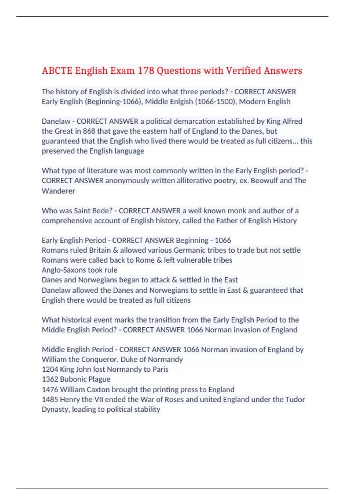 ABCTE English Exam 178 Questions with Verified Answers The history of English is divided into what three periods? - CORRECT ANSWER Early English (Beginning-1066), Middle Enlgish (), Modern English Danelaw - CORRECT ANSWER a political demarcation established by King Alfred the Great in 868 that gave the eastern half of England to the Danes, but guaranteed that the English who lived there would be treated as full citizens... this preserved the English language What type of literature was most commonly written in the Early English period? - CORRECT ANSWER anonymously written alliterative poetry, ex. Beowulf and The Wanderer Who was Saint Bede? - CORRECT ANSWER a well known monk and author of a comprehensive account of English history, called the Father of English History Early English Period - CORRECT ANSWER Beginning - 1066 Romans ruled Britain & allowed various Germanic tribes to trade but not settle Romans were called back to Rome & left vulnerable tribes Anglo-Saxons took rule Danes and Norwegians began to attack & settled in the East Danelaw allowed the Danes and Norwegians to settle in East & guaranteed that English there would be treated as full citizens What historical event marks the transition from the Early English Period to the Middle English Period? - CORRECT ANSWER 1066 Norman invasion of England Middle English Period - CORRECT ANSWER 1066 Norman invasion of England by William the Conqueror, Duke of Normandy 1204 King John lost Normandy to Paris 1362 Bubonic Plague 1476 William Caxton brought the printing press to England 1485 Henry the VII ended the War of Roses and united England under the Tudor Dynasty, leading to political stability What historical event brought about the first major social upheaval? - CORRECT ANSWER 1362 Bubonic Plague Who was the most important author of the Middle English Period and why? - CORRECT ANSWER Geoffrey Chaucer, who wrote poems in English as his peers wrote in Latin and French Great Vowel Shift - CORRECT ANSWER late 1300's and represented a change in the pronunciation of long vowels, ex. Mouse being pronounced moosemouse What historical event led to the standardization of language? - CORRECT ANSWER 1476 William Caxton brought the printing press to England What three historical events mark the transition from the Middle English Period to the Modern English Period? - CORRECT ANSWER 1. The Great Vowel Shift 2. William Caxton brought the printing press to England 3. Henry the VII ended the War of Roses and united England under the Tudor Dynasty Inkhorn terms - CORRECT ANSWER a derogatory term for a word coined in English from Latin or Greek roots and meant to sound scholarly, surviving words include educate, mundane, celebrate, confidence, and verbosity Modern English Period - CORRECT ANSWER Under Queen Elizabeth I, England began gaining new territories including the colonies that would become the USA, to which the English language spread Etymology - CORRECT ANSWER the study of an origin of a word and the way that word's meaning has changed over time Semantic shift - CORRECT ANSWER language change process by which the meaning of one word replaces another word ex. Bead comes from the Anglo-Saxon word for prayer since people prayed on telling beads similar to Catholic rosaries Ethnonym - CORRECT ANSWER language change process by which a word that identifies a group or nation to others becomes the word by which they are called ex. Cockney from the phrase cock's egg, which was a negative term used by strong countrymen when referring to weaker townsmen, now means a person from London Generalization - CORRECT ANSWER language change process by which a very specific word gains a more general meaning ex. Holiday comes from holy-day, originally used to designate special religious holidays Narrowing - CORRECT ANSWER language change process by which a word with a general meaning becomes very specific, ex. Hound from the word dog Loss of motivation - CORRECT ANSWER language change process by which the original word loses their form because speakers no longer remember the significance of them ex. Lord stemming from loaf-keeper Metaphor (language change process) - CORRECT ANSWER language change process by which a concrete meaning gains abstract meaning ex. Sharp, as in clever, comes from the concrete meaning as in sharp knife Amelioration - CORRECT ANSWER the process by which a word's meaning improves over time, ex. Naughty is derived from naught (wicked, morally bad), has changed to mean mischievous Pejoration - CORRECT ANSWER the process by which a word's meaning worsens over time, ex. Villain (thief or scoundrel) originally meant pleasant Taboo words - CORRECT ANSWER the process by which a word perceived as dangerous is replaced by euphemisms, ex. Passed away instead of died Calques - CORRECT ANSWER words and phrases that are translated word-for-word from the foreign language, ex. "it goes without saying" is derived from the French phrase "ca va sans dire" Greek roots and affixes - CORRECT ANSWER Epi (on, at, beside), Temnein (to cut), Eu (good, well), Phanai (speech), Phor (to bear), Meta (beyond), Soph (wise), Moros (fool), Athropo (man), Logia (study), Sunkrasis (mixture), Gyne (woman), Mis (hate, wrong), Glotta (language, tongue), Poly (many) Latin roots and affixes - CORRECT ANSWER Bene (good, well), Dicere (to speak), Con (with, together), Vincere (conquer), e (out), Ducere (to lead), Inter (between), Capere (to take, seize), Male (bad), Velle (to want), Mittere (to send), Ad (to, toward), Cedere (to go), Ante (before), Libra (scale), De (down), Sistere (to stand), Per (through), Cemere (to sift), Se (Apart) Anglo-Saxon roots and affixes - CORRECT ANSWER Be (make, cause to be), For (completely), Fore (before, in front of), Some (characterized by) Idioms - CORRECT ANSWER expression or constructions whose meanings do not logically follow the meaning of the individual words that make them up ex. Couch potato, on the dot Cliques - CORRECT ANSWER words to ph