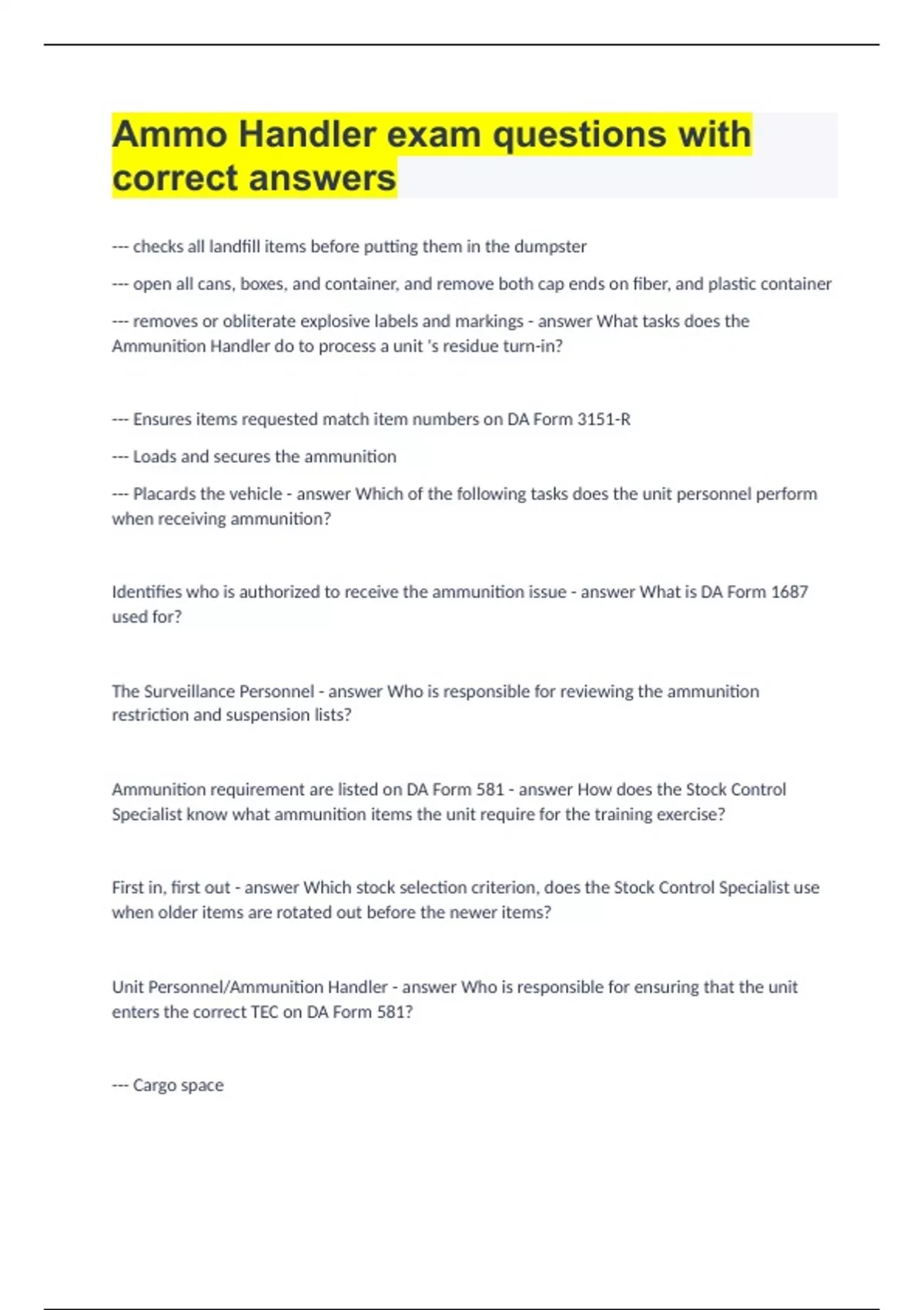 Ammo Handler exam questions with correct answers.
