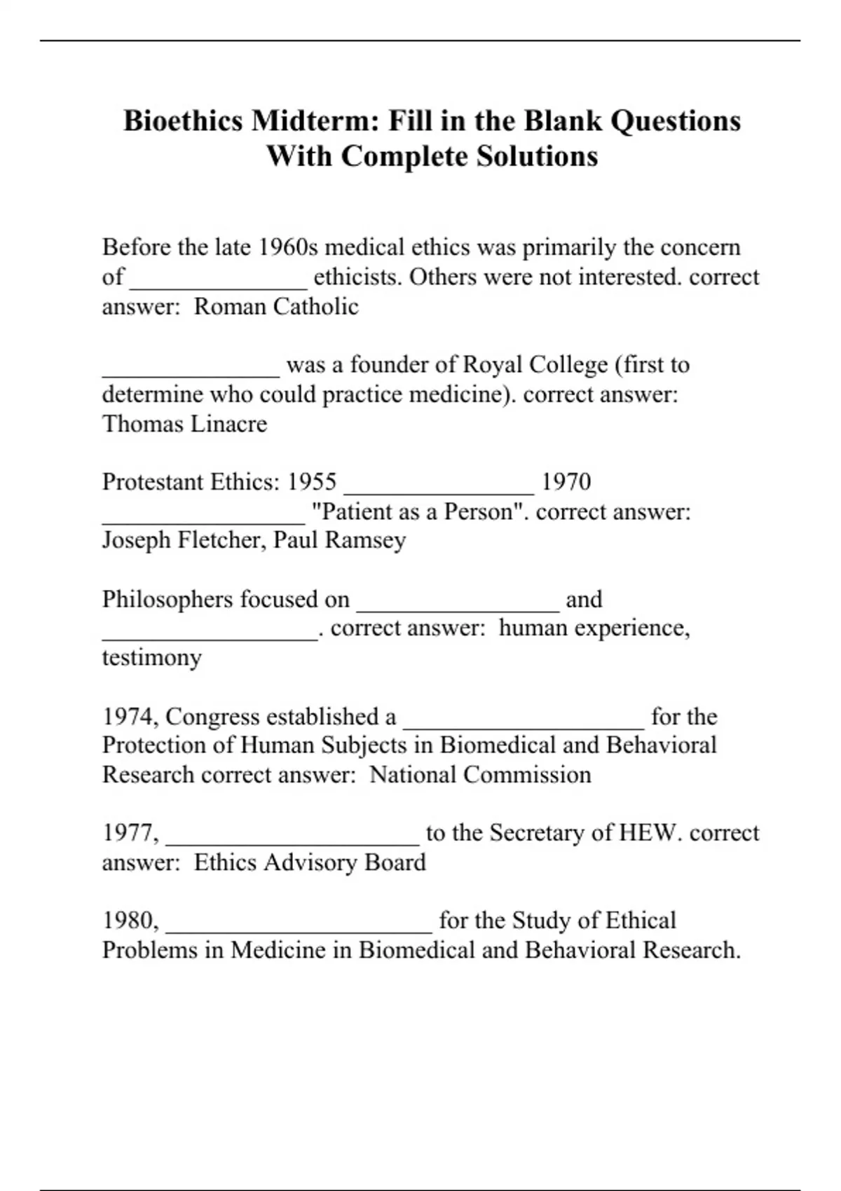Bioethics Midterm: Fill in the Blank Questions With Complete Solutions