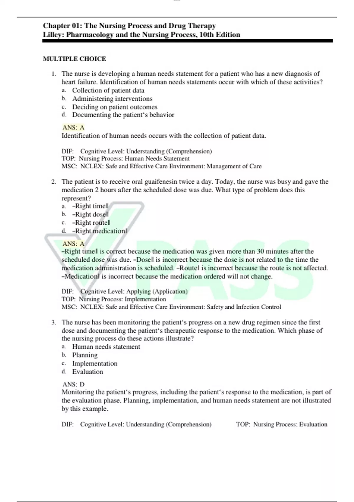 Chapter 01: The Nursing Process and Drug Therapy Lilley: Pharmacology and the Nursing Process, 10th Edition MULTIPLE CHOICE 1. The nurse is developing a human needs statement for a patient who has a new diagnosis of heart failure. Identification of human needs statements occur with which of these activities? a. Collection of patient data b. Administering interventions c. Deciding on patient outcomes d. Documenting the patient‘s behavior ANS: A Identification of human needs occurs with the collection of patient data. DIF: Cognitive Level: Understanding (Comprehension) TOP: Nursing Process: Human Needs Statement MSC: NCLEX: Safe and Effective Care Environment: Management of Care 2. The patient is to receive oral guaifenesin twice a day. Today, the nurse was busy and gave the medication 2 hours after the scheduled dose was due. What type of problem does this represent? a. ―Right time‖ b. ―Right dose‖ c. ―Right route‖ d. ―Right medication‖ ANS: A ―Right time‖ is correct because the medication was given more than 30 minutes after the scheduled dose was due. ―Dose‖ is incorrect because the dose is not related to the time the medication administration is scheduled. ―Route‖ is incorrect because the route is not affected. ―Medication‖ is incorrect because the medication ordered will not change. DIF: Cognitive Level: Applying (Application) TOP: Nursing Process: Implementation MSC: NCLEX: Safe and Effective Care Environment: Safety and Infection Control 3. The nurse has been monitoring the patient‘s progress on a new drug regimen since the first dose and documenting the patient‘s therapeutic response to the medication. Which phase of the nursing process do these actions illustrate? a. Human needs statement b. Planning c. Implementation d. Evaluation ANS: D