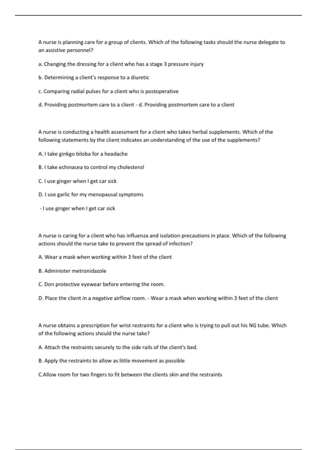nurse is planning care for a group of clients. Which of the following tasks should the nurse delegate to an assistive personnel? a. Changing the dressing for a client who has a stage 3 pressure injury b. Determining a client's response to a diuretic c. Comparing radial pulses for a client who is postoperative d. Providing postmortem care to a client - d. Providing postmortem care to a client A nurse is conducting a health assessment for a client who takes herbal supplements. Which of the following statements by the client indicates an understanding of the use of the supplements? A. I take ginkgo biloba for a headache B. I take echinacea to control my cholesterol C. I use ginger when I get car sick D. I use garlic for my menopausal symptoms - I use ginger when I get car sick A nurse is caring for a client who has influenza and isolation precautions in place. Which of the following actions should the nurse take to prevent the spread of infection? A. Wear a mask when working within 3 feet of the client B. Administer metronidazole C. Don protective eyewear before entering the room. D. Place the client in a negative airflow room. - Wear a mask when working within 3 feet of the client