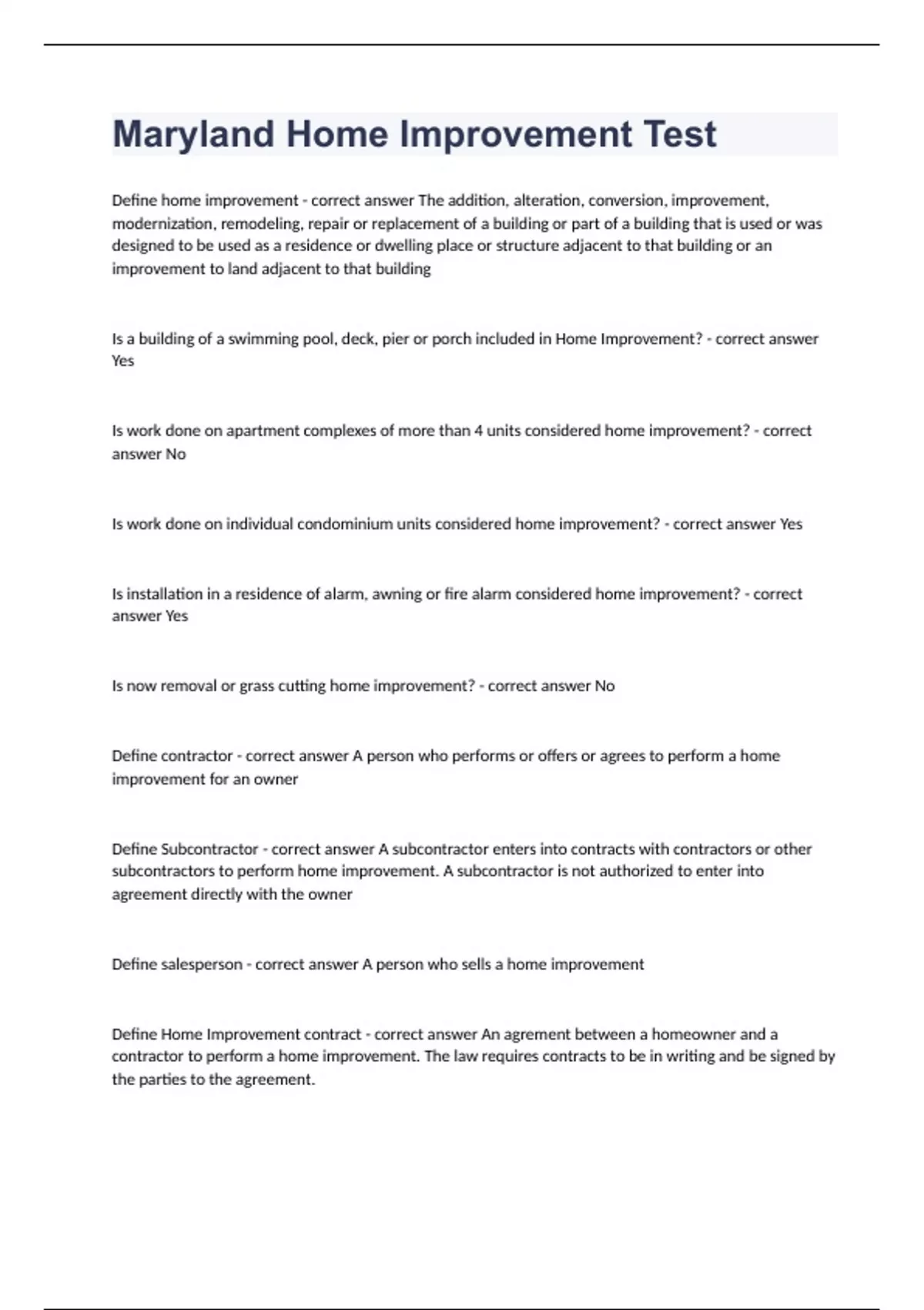 Maryland Home Improvement Test Define home improvement - correct answer The addition, alteration, conversion, improvement, modernization, remodeling, repair or replacement of a building or part of a building that is used or was designed to be used as a residence or dwelling place or structure adjacent to that building or an improvement to land adjacent to that building Is a building of a swimming pool, deck, pier or porch included in Home Improvement? - correct answer Yes Is work done on apartment complexes of more than 4 units considered home improvement? - correct answer No Is work done on individual condominium units considered home improvement? - correct answer Yes Is installation in a residence of alarm, awning or fire alarm considered home improvement? - correct answer Yes Is now removal or grass cutting home improvement? - correct answer No Define contractor - correct answer A person who performs or offers or agrees to perform a home improvement for an owner Define Subcontractor - correct answer A subcontractor enters into contracts with contractors or other subcontractors to perform home improvement. A subcontractor is not authorized to enter into agreement directly with the owner Define salesperson - correct answer A person who sells a home improvement Define Home Improvement contract - correct answer An agrement between a homeowner and a contractor to perform a home improvement. The law requires contracts to be in writing and be signed by the parties to the agreement. Define Owner - correct answer Owner, owner's agent , tenant or other person authorized to enter into a home improvement contract Define license - correct answer is either a contractor or salesperson license that is issued by the Home Improvement Commission. Does a handyman need a license? - correct answer Yes True or False: Home Improvement law does not apply if one of the parties is a government agency - correct answer True Work done a residence inside a military base is excluded from licensing requirements - correct answer True Can local jurisdictions issue home improvement lincenses - correct answer No, only MD Home Improvement Commission is authorized to issue a license to solicit, sell, or perform home improvement services in Maryland Can two or more individuals (such as homeowner and contractor) lawfully agree to ignore the Home Improvement licensing requirement? - correct answer No, waiver is prohibited When was the commission established? - correct answer 1962 How Many commissioners are there? - correct answer 9 (4 must have experience in the business of home improvement; 4 are members of the general public that represent cosumers; and 1 must have experience in banking and finance) What is the most important role of the Commissioners? - correct answer To promulgate regulations for the Commission. These regulations help the public better understand the Home Improvement Law and the Commission's policies How often are the meetings? - correct answer bi-monthly. Meetings are open to the public.