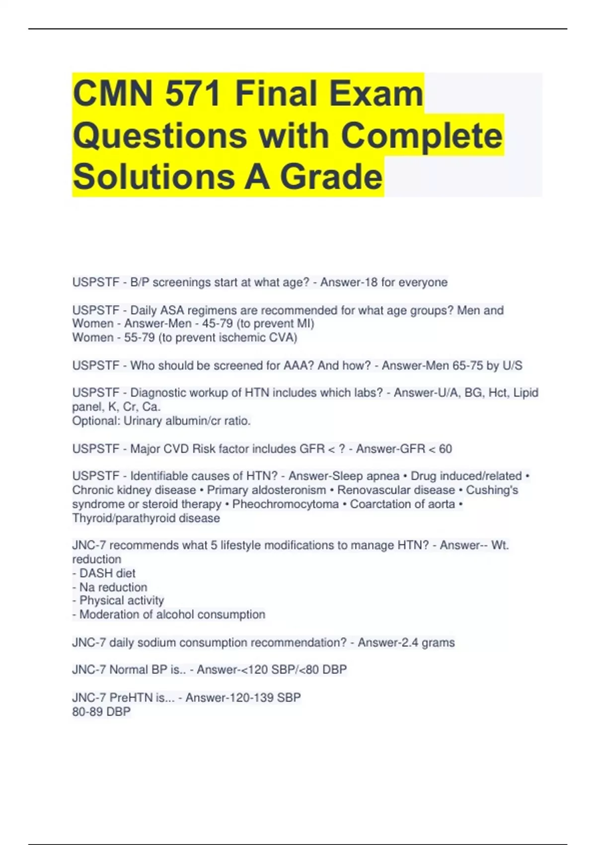 CMN 571 Final Exam Questions with Complete Solutions A Grade USPSTF - B/P screenings start at what age? - Answer-18 for everyone USPSTF - Daily ASA regimens are recommended for what age groups? Men and Women - Answer-Men - 45-79 (to prevent MI) Women - 55-79 (to prevent ischemic CVA) USPSTF - Who should be screened for AAA? And how? - Answer-Men 65-75 by U/S USPSTF - Diagnostic workup of HTN includes which labs? - Answer-U/A, BG, Hct, Lipid panel, K, Cr, Ca. Optional: Urinary albumin/cr ratio. USPSTF - Major CVD Risk factor includes GFR < ? - Answer-GFR < 60 USPSTF - Identifiable causes of HTN? - Answer-Sleep apnea • Drug induced/related • Chronic kidney disease • Primary aldosteronism • Renovascular disease • Cushing's syndrome or steroid therapy • Pheochromocytoma • Coarctation of aorta • Thyroid/parathyroid disease JNC-7 recommends what 5 lifestyle modifications to manage HTN? - Answer-- Wt. reduction - DASH diet - Na reduction - Physical activity - Moderation of alcohol consumption JNC-7 daily sodium consumption recommendation? - Answer-2.4 grams JNC-7 Normal BP is.. - Answer-<120 SBP/<80 DBP JNC-7 PreHTN is... - Answer-120-139 SBP 80-89 DBP JNC-7 Stage 1 HTN is... - Answer-140-159 SBP 90-99 DBP JNC-7 Stage 2 HTN is... - Answer-≥160 SBP ≥ 100 DBP DASH diet recommended daily Cholesterol intake? a. 100 mg b. 125 mg c. 150 mg d. 175 mg - Answer-c. 150 mg DASH diet recommended daily Sodium intake for a middle-aged black man with HTN? a. 1000 mg b. 1500 mg c. 2000 mg d. 2300 mg - Answer-b. 1500 mg