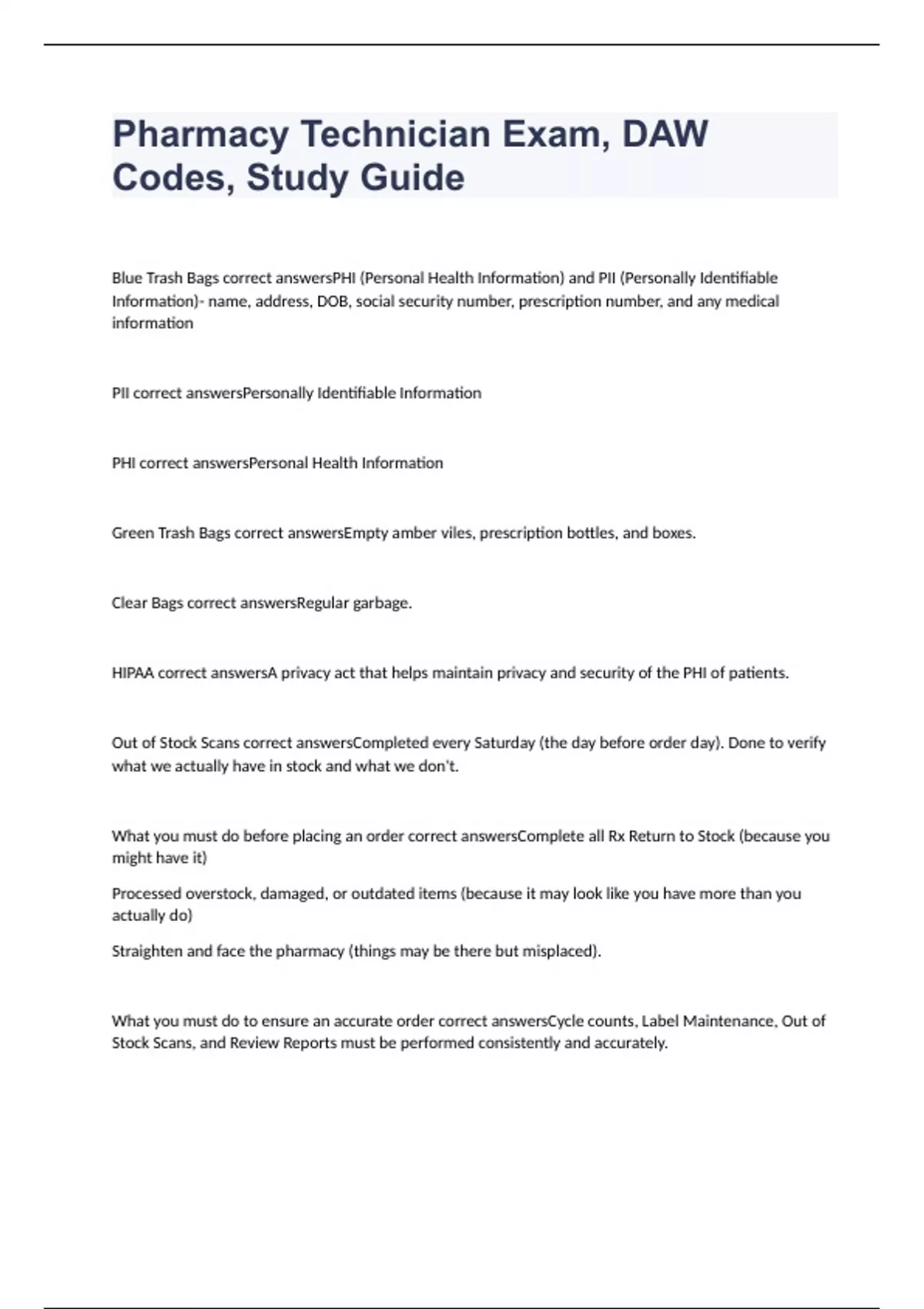 Blue Trash Bags correct answersPHI (Personal Health Information) and PII (Personally Identifiable Information)- name, address, DOB, social security number, prescription number, and any medical information PII correct answersPersonally Identifiable Information PHI correct answersPersonal Health Information Green Trash Bags correct answersEmpty amber viles, prescription bottles, and boxes. Clear Bags correct answersRegular garbage. HIPAA correct answersA privacy act that helps maintain privacy and security of the PHI of patients. Out of Stock Scans correct answersCompleted every Saturday (the day before order day). Done to verify what we actually have in stock and what we don't. What you must do before placing an order correct answersComplete all Rx Return to Stock (because you might have it) Processed overstock, damaged, or outdated items (because it may look like you have more than you actually do) Straighten and face the pharmacy (things may be there but misplaced). What you must do to ensure an accurate order correct answersCycle counts, Label Maintenance, Out of Stock Scans, and Review Reports must be performed consistently and accurately.