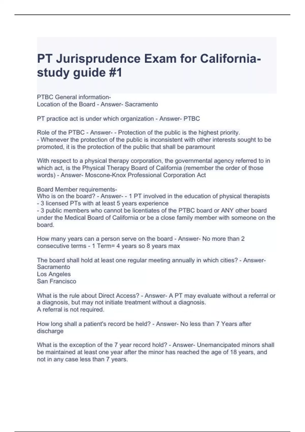 PT Jurisprudence Exam for California- study guide #1 with complete solutions