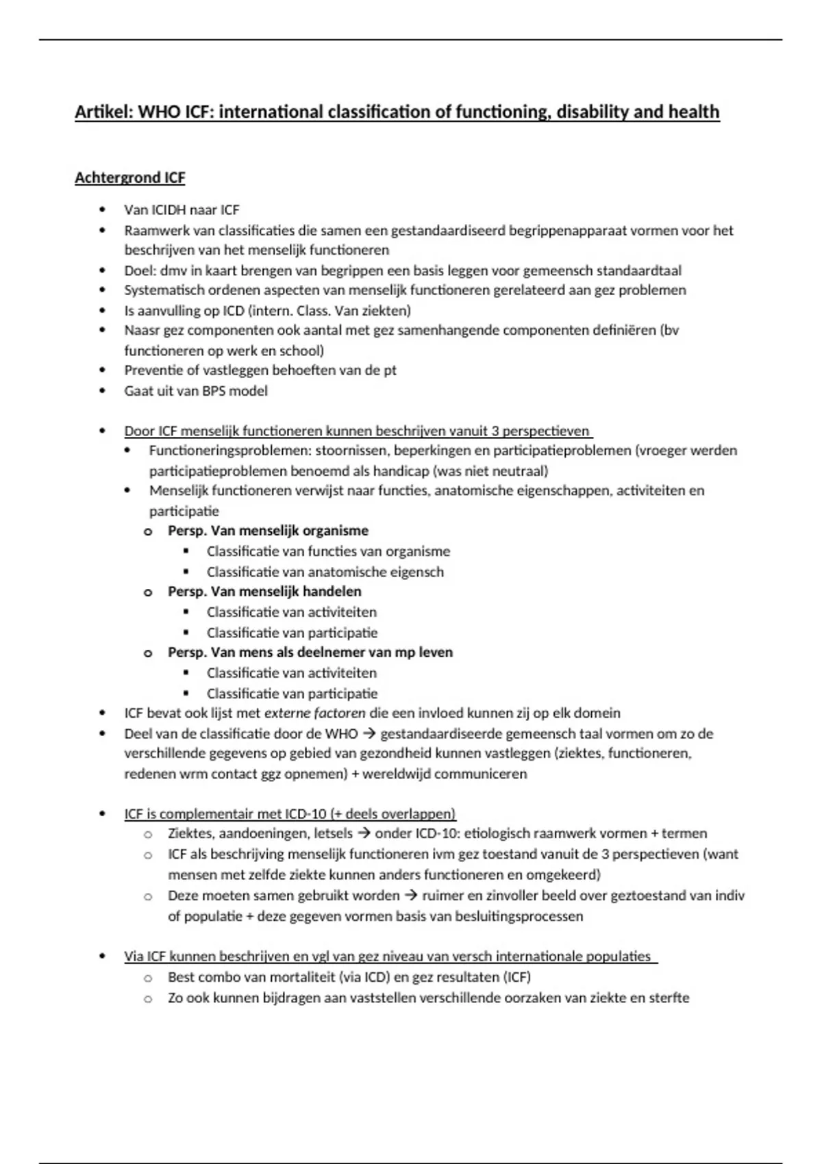 o ICF als beschrijving menselijk functioneren ivm gez toestand vanuit de 3 perspectieven (want