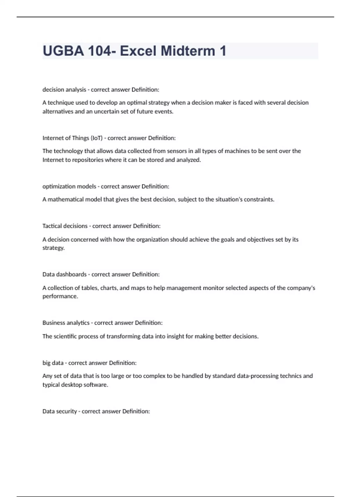 UGBA 104- Excel Midterm 1decision analysis - correct answer Definition: A technique used to develop an optimal strategy when a decision maker is faced with several decision alternatives and an uncertain set of future events. Internet of Things (IoT) - correct answer Definition: The technology that allows data collected from sensors in all types of machines to be sent over the Internet to repositories where it can be stored and analyzed. optimization models - correct answer Definition: A mathematical model that gives the best decision, subject to the situation's constraints. Tactical decisions - correct answer Definition: A decision concerned with how the organization should achieve the goals and objectives set by its strategy. Data dashboards - correct answer Definition: A collection of tables, charts, and maps to help management monitor selected aspects of the company's performance. Business analytics - correct answer Definition: The scientific process of transforming data into insight for making better decisions. big data - correct answer Definition: Any set of data that is too large or too complex to be handled by standard data-processing technics and typical desktop software. Data security - correct answer Definition: Protecting stored data from destructive forces or unauthorized users. Descriptive analytics - correct answer Definition: Analytical tools that describe what has happened. Data mining - correct answer Definition: The use of analytical techniques for better understanding patterns and relationships that exist in large data sets. MapReduce - correct answer Definition: Programming model used within Hadoop that performs the two major steps for which it is named: the map step and the reduce step. The map step divides the data into manageable subsets and distributes it to the computers in the cluster for storing and processing. The reduce step collects answers from the nodes and combines them into an answer to the original problem. Hadoop - correct answer Definition: An open-source programming environment that supports big data processing through distributed storage and distributed processing on clusters of computers. data query - correct answer Definition: A request for information with certain characteristics from a database. advanced analytics - correct answer Definition: Predictive and prescriptive analytics. data scientists - correct answer Definition: Analysts trained in both computer science and statistics who know how to effectively process and analyze massive amounts of data. simulation optimization - correct answer Definition: The use of probability and statistics to model uncertainty, combined with optimization techniques, to find good decisions in highly complex and highly uncertain settings. Strategic decisions - correct answer Definition: A decision that involves higher-level issues and that is concerned with the overall direction of the organization, defining the overall goals and aspirations for the organization's future. Simulation - correct answer Definition: The use of probability and statistics to construct a computer model to study the impact of uncertainty on the decision at hand. Predictive analytics - correct answer Definition: Techniques that use models constructed from past data to predict the future or to ascertain the impact of one variable on another. prescriptive analytics - correct answer Definition: Techniques that analyze input data and yield a best course of action. utility theory - correct answer Definition: The study of the total worth or relative desirability of a particular outcome that reflects the decision maker's attitude toward a collection of factors such as profit, loss, and risk. standard deviation - correct answer Definition: A measure of variability computed by taking the positive square root of the variance. percentile - correct answer Definition: A value such that approximately p percent of the observations have values less than the pth percentile; hence, approximately (100 - p) percent of the observations have values greater than the pth percentile. The 50th percentile is the median. variation - correct answer Definition: