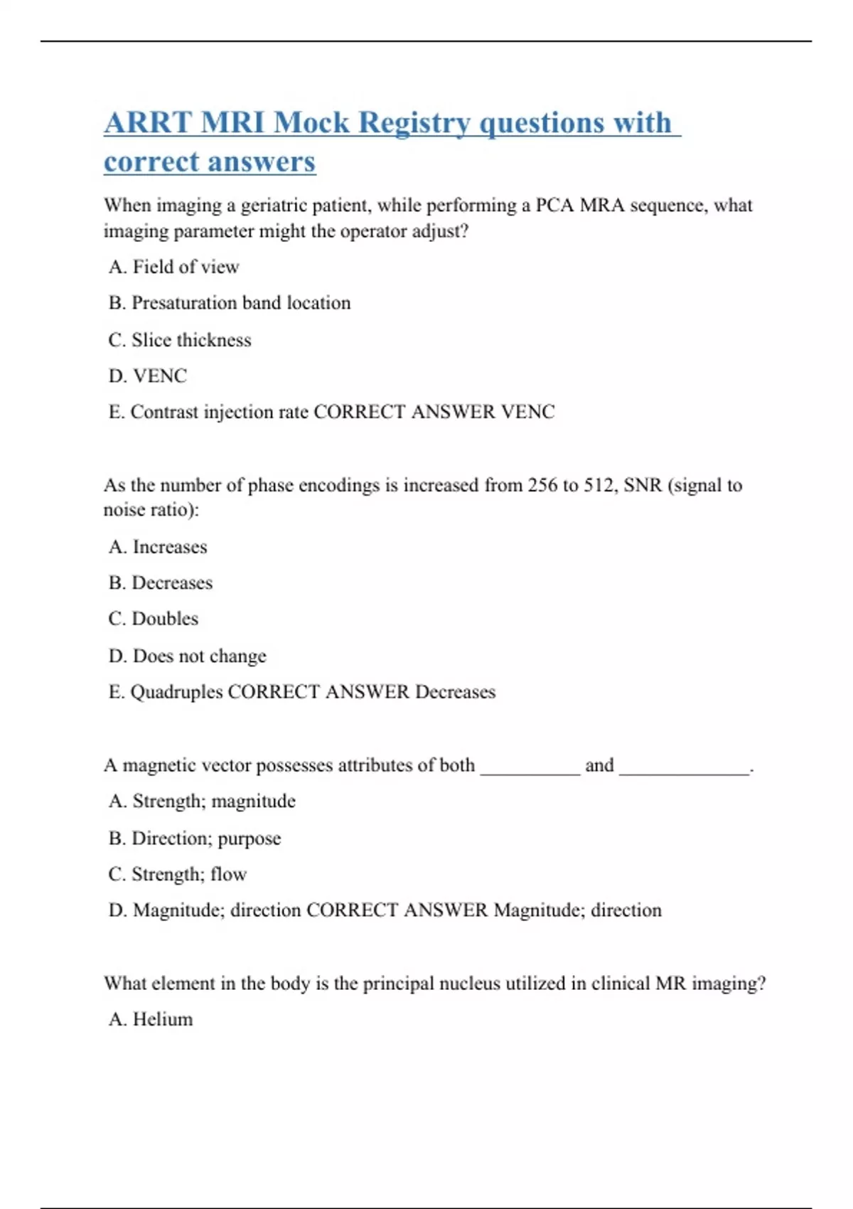 When imaging a geriatric patient, while performing a PCA MRA sequence, what imaging parameter might the operator adjust? A. Field of view B. Presaturation band location C. Slice thickness D. VENC E. Contrast injection rate CORRECT ANSWER VENC As the number of phase encodings is increased from 256 to 512, SNR (signal to noise ratio): A. Increases B. Decreases C. Doubles D. Does not change E. Quadruples CORRECT ANSWER Decreases A magnetic vector possesses attributes of both __________ and _____________. A. Strength; magnitude B. Direction; purpose C. Strength; flow D. Magnitude; direction CORRECT ANSWER Magnitude; direction What element in the body is the principal nu