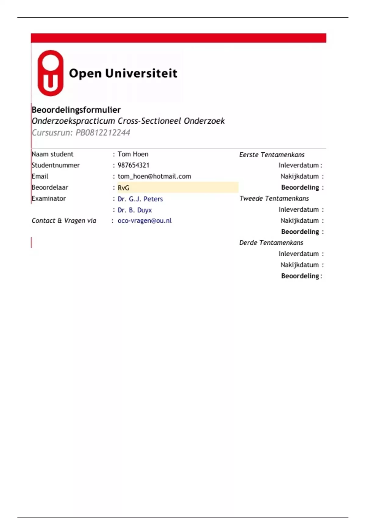 Onderzoekspracticum Cross sectioneel Onderzoek (PB0802) Beoordeling