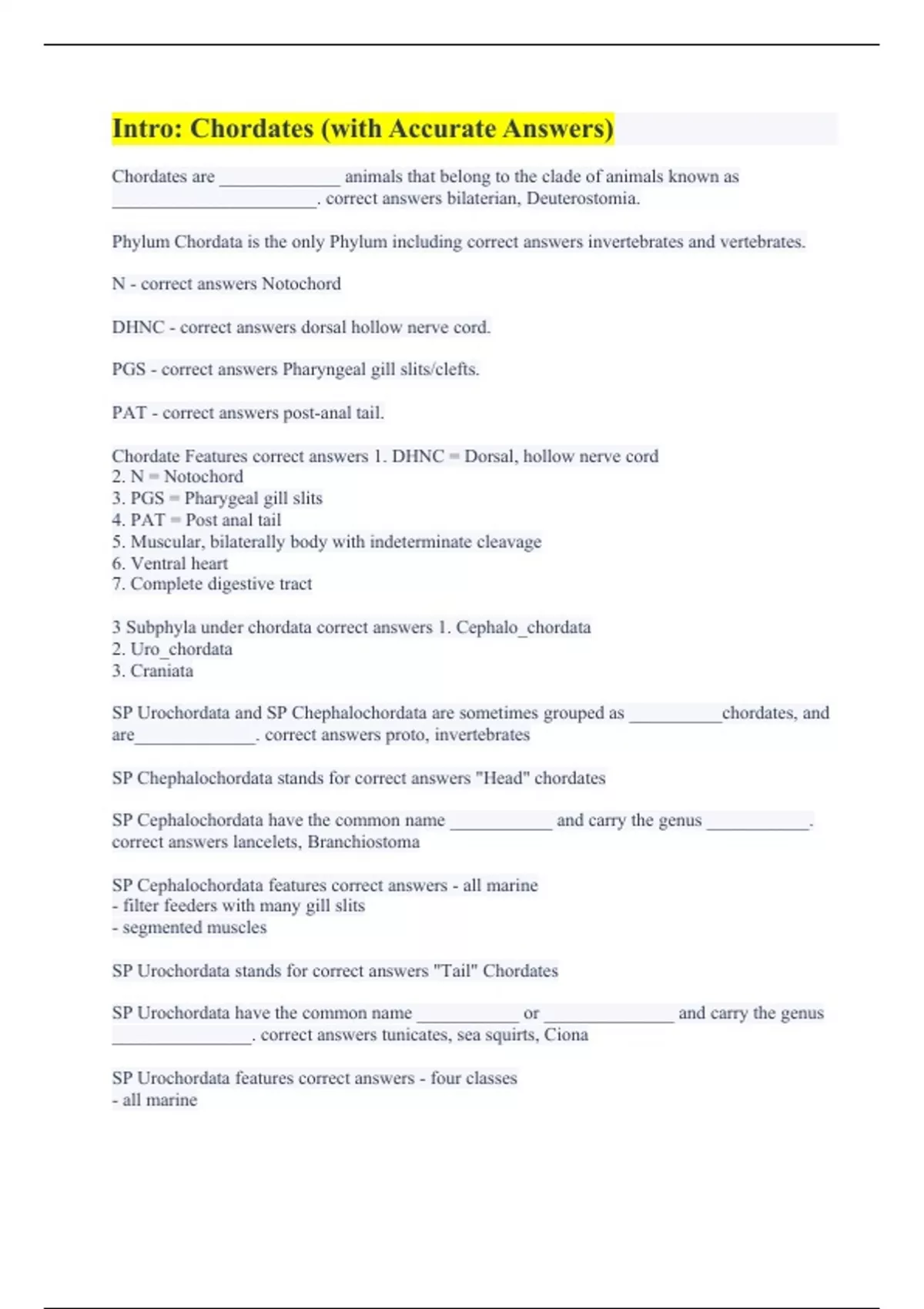 Intro: Chordates (with Accurate Answers)