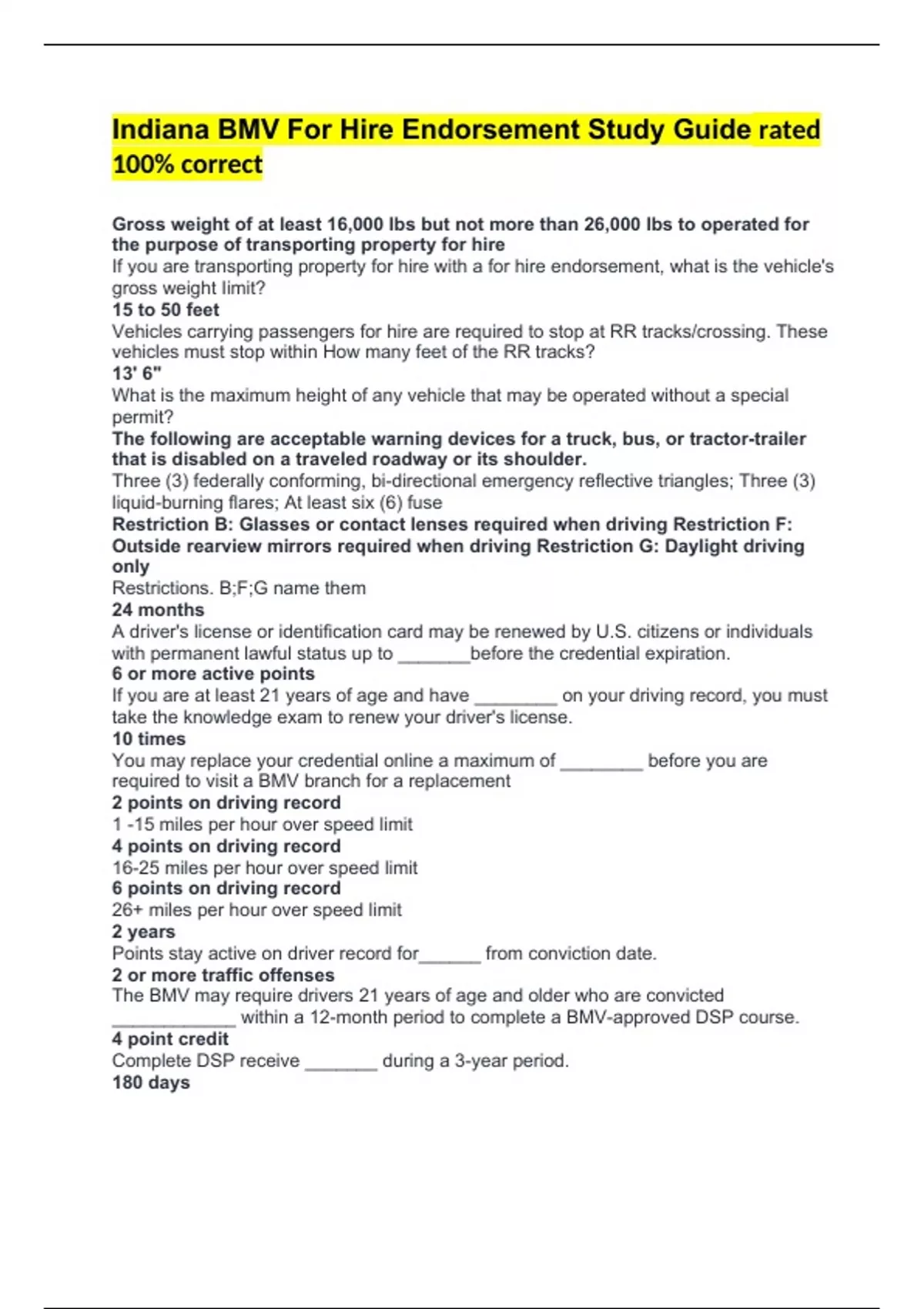 Indiana BMV For Hire Endorsement Study Guide rated 100% correct Gross weight of at least 16,000 lbs but not more than 26,000 lbs to operated for the purpose of transporting property for hire If you are transporting property for hire with a for hire endorsement, what is the vehicle's gross weight Iimit? 15 to 50 feet Vehicles carrying passengers for hire are required to stop at RR tracks/crossing. These vehicles must stop within How many feet of the RR tracks? 13' 6" What is the maximum height of any vehicle that may be operated without a special permit? The following are acceptable warning devices for a truck, bus, or tractor-trailer that is disabled on a traveled roadway or its shoulder. Three (3) federally conforming, bi-directional emergency reflective triangles; Three (3) liquid-burning flares; At least six (6) fuse Restriction B: Glasses or contact lenses required when driving Restriction F: Outside rearview mirrors required when driving Restriction G: Daylight driving only Restrictions. B;F;G name them 24 months A driver's license or identification card may be renewed by U.S. citizens or individuals with permanent lawful status up to _______before the credential expiration. 6 or more active points If you are at least 21 years of age and have ________ on your driving record, you must take the knowledge exam to renew your driver's license. 10 times You may replace your credential online a maximum of ________ before you are required to visit a BMV branch for a replacement 2 points on driving record 1 -15 miles per hour over speed limit 4 points on driving record 16-25 miles per hour over speed limit 6 points on driving record 26+ miles per hour over speed limit 2 years Points stay active on driver record for______ from conviction date. 2 or more traffic offenses The BMV may require drivers 21 years of age and older who are convicted ____________ within a 12-month period to complete a BMV-approved DSP course. 4 point credit Complete DSP receive _______ during a 3-year period. 180 days Motorist who fails a chemical test will face a suspension of driving privileges for _________. One year Motorist who refuses to submit to a chemical test will face a suspension of driving privileges for _________. 25 mph A slow moving vehicle emblem has an orange fluorescent center and a red reflective border and indicates a slow moving vehicle which cannot exceed _______? True Yellow lane markings separate multiple lanes of traffic going in opposite directions. You may cross a broken yellow line to pass another vehicle when it is safe, but you should not cross a solid line except to turn. True White lane markings separate multiple lanes of traffic going in the same direction. Most roads with more than two lanes have broken white lines to separate the lanes. You may cross a broken white line when it is safe to change lanes, but you should not cross a solid white line. 200 feet and 300 feet When changing lanes to prepare for a turn, you must signal your intention to do so at least _____ prior to changing lanes. Your signal distance must be at least ______ before you turn if you are operating a vehicle in a speed zone of at least 50 mph. 100 feet Make sure the passing lane is clear of traffic, as you must return to the right side of the road no less than _____before any oncoming vehicle. 100 feet Do not try to pass within ________of an intersection, railroad crossing, bridge, viaduct, or tunnel? Do Not If another vehicle is passing you on the left-hand side of the road, allow the other vehicle to pass safely and ______ increase your speed? 200 feet and 300 feet You must give a proper turn signal at least _______ before turning or changing lanes. If the posted speed limit is 50 mph or more, you must give a proper turn signal at least ______ before turning or changing lanes. 40mph 60 mph When not driving on an interstate or state highway, the maximum speed limit for a school bus is ________ unless the posted speed limit is lower. The maximum speed limit for a school bus on an interstate or highway is _________ or the posted speed limit. Bad weather in poor visibility, unsafe vehicle conditions, slicker icy roads, impaired physical condition, driving with worn tires, hazardous conditions on road service Driving at the posted speed limit or in excess of it during the following roadway conditions is even more dangerous list at least three. 2 to 3 seconds A good rule for drivers to follow is stay at least _____ behind the vehicle ahead. True If your vehicle begins to lose traction or the rear wheels begin sliding sideways, ease off the gas pedal? True If your vehicle has conventional brakes, turn the steering wheel in a controlled manner in the direction of the rear of the car is sliding? inexperienced drivers, improperly sized and or inflated tires, incorrectly loaded cargo and or passengers that could affect the vehicle's center of gravity. Rollover risk of a 15 passenger van increases dramatically as a number of occupants increases. Other risk include: 45 mph and 75 mph and 55 mph Fuel consumption increases steadily above ______, with passenger cars and light trucks using approximately 50% more fuel traveling at _____ then at _______ per hour. One pound per inch (PSI) Tires have been known to lose up to ________ every month, so check all tires including your spare, once a month or before a long trip. less than 500 feet Drivers must use headlights between sunset and sunrise as well as any other time in which visibility is ______. 500 feet and 200 feet When headlights are on, lower headlight beams must be use when approaching within __________ of an oncoming vehicle or when following within ____________ of the rear of another vehicle? 16.5% What is the estimate of all fatal motor vehicle crashes involved a fatigued driver? 55mph Texting is the most alarming distraction. Sending or texting takes your eyes off the road for five seconds. At _______, that's like driving the length of an entire football field with yo