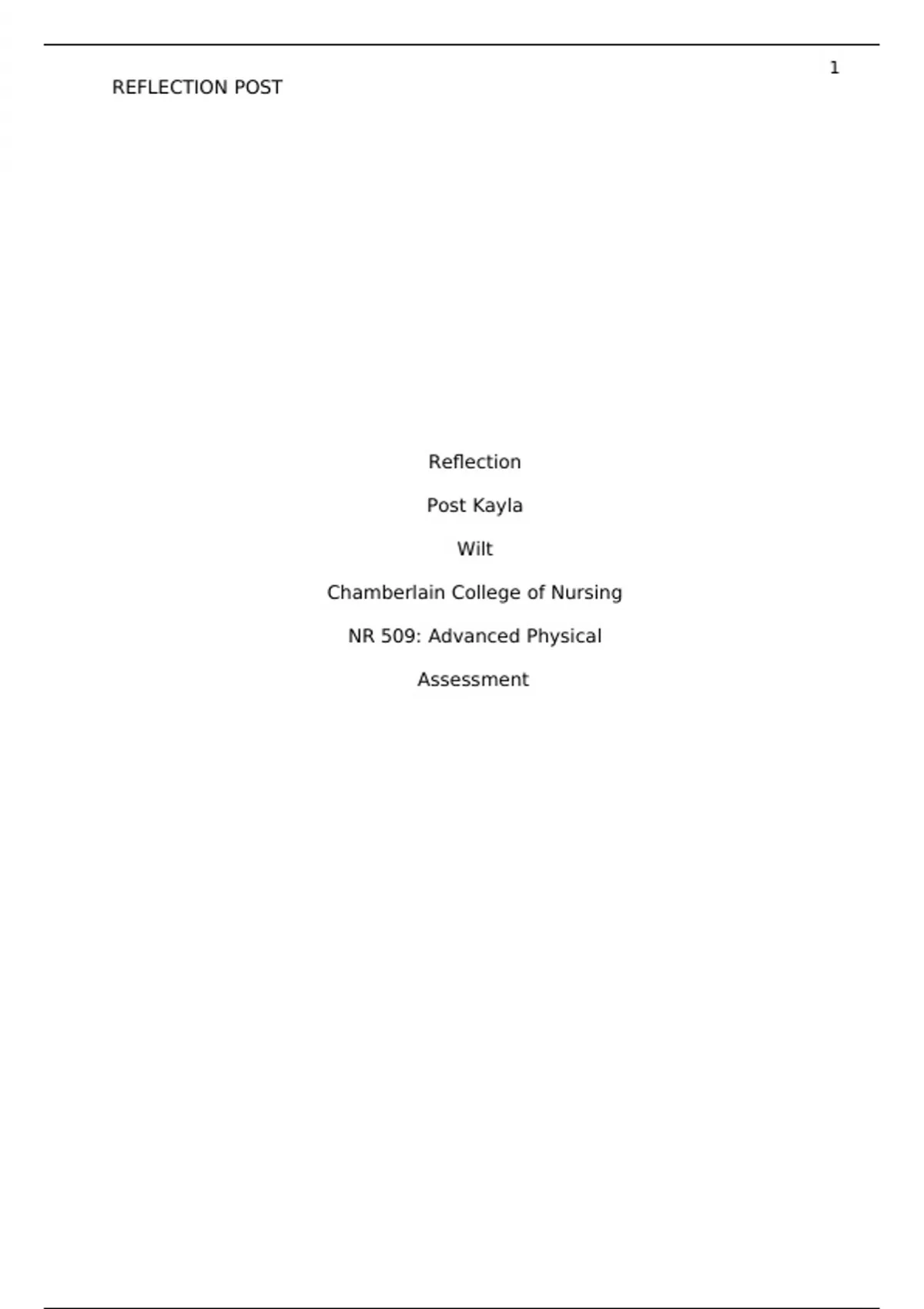 Reflection Post Kayla Wilt Chamberlain College of Nursing NR 509: Advanced Physical Assessment Prior to taking this course, I thought of myself to be very proficient in obtaining information from a patient. Now that we are winding down in this course, I realize how much I have learned and gained. There were many weeks where I stressed more than ever because I just could not get to the bottom of the problem. Many times, I realized after submitting an assignment that I could have asked more or that I needed to change my diagnosis. I did not have to deal with SOAP notes very much in nursing school, nor do I have to perform them in my current profession. From this course, I have gained the proper skills to writing a thorough SOAP note, distinguishing differential diagnosis, and everything in between. All the practice performed during this course has helped me gain better understanding, knowledge and understanding of what will be expected along with what I will observe during the practicum. Reflect Upon Program Outcome (PO) 1 Over the past 8 weeks this course has allowed me to grow tremendously. Program Outcome (PO) 1 is to provide high quality, safe, patient-centered care grounded in holistic health principles. NR 509 Advanced Physical Assessment has given me the essential tools to achieve this outcome. This course has provided me with information on how to properly perform a complete history and physical, as well as a focused assessment. I have gained more confidence in speaking to a patient and asking them more personal questions. This course has taught me how to collect important data to collect information need to obtain a thorough history of the patient. Having the ability to obtain and process one’s history along with their chief complaint has allowed me to focus more on the patient and involve them more in their plan of care. Prior to taking this course, I was constantly thinking of the next correct question to ask instead of listening to what the patient had to say. I would automatically assume I knew was what ailing them and never investigate any further. Having the opportunity to work with a virtual simulator has given me the opportunity to work in the comfort of my own home while trying to find a “groove” of asking patients crucial assessment questions. There may not be hands-on with virtual simulation, but it allows one to see where to inspect, auscultate, percuss and palpate. This course has also given me the opportunity to learn how to properly chart/dictate on a patient’s chart. Using proper medical terminology makes referring a patient with their chart more professional. By using proper medical terminology, the referring medical provider will be able to know exactly where I was finding an “issue” and use my descriptive terms to understand what I was finding. This course has reminded me that even though we are trying to determine the cause of the patient’s issues, we need to treat them like a human being. They have outside issues occurring that do not just stop because they have fallen ill. Sometimes just listening to the patient’s outside problems can be all they need; an ear to listen. We may not know everyone’s background story prior to assessing them, but it is important to be willing to listen in order to effectively treat and care for our patients.