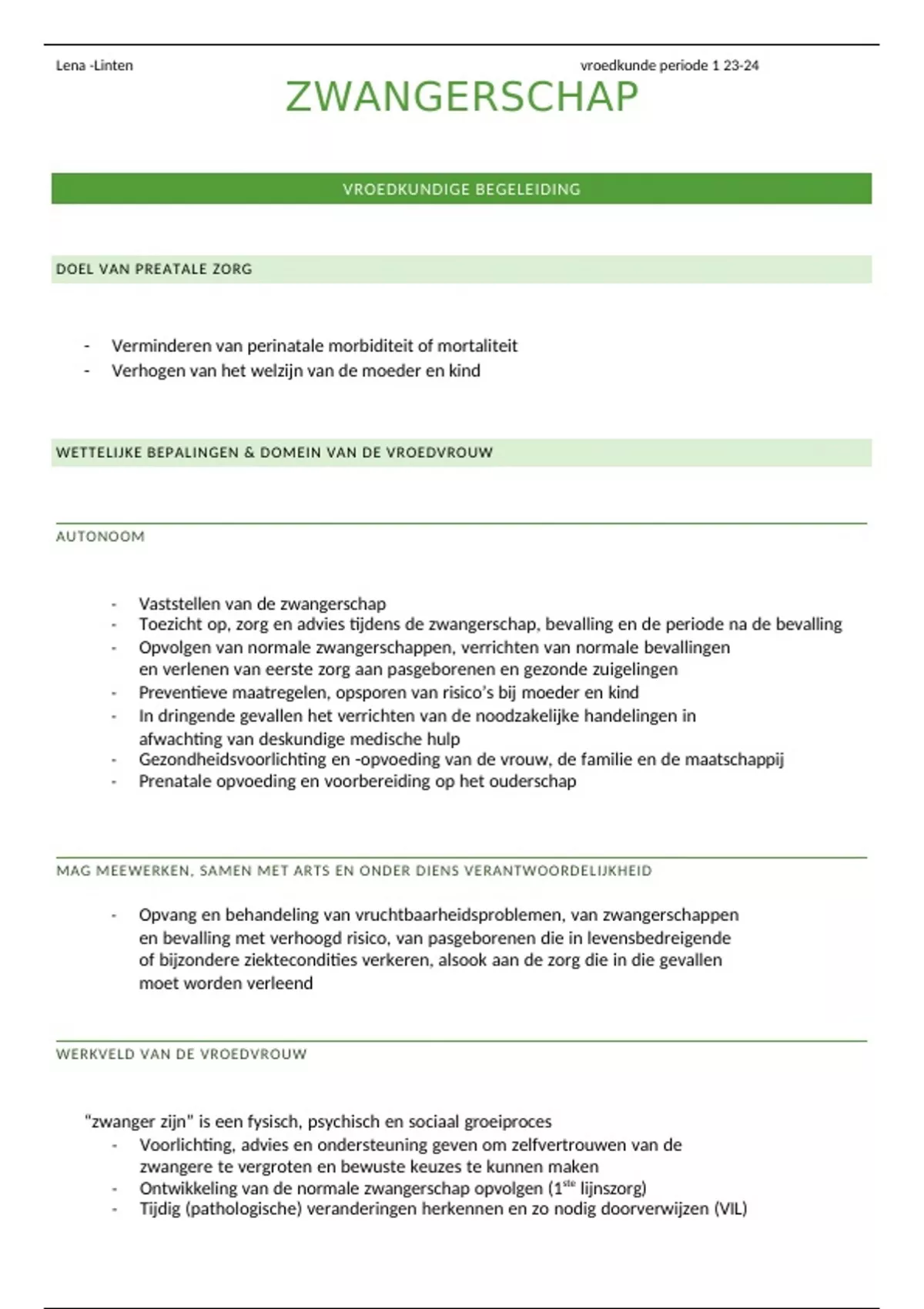 Deze samenvatting is van het vak zwangerschap, het onderdeel vroedkundige begeleiding. Gegeven in het eerste jaar vroedkunde aan KDG, door Liesbeth Van Kelst. De samenvatting bestaat uit de powerpoint en aantekeningen tijdens de les.