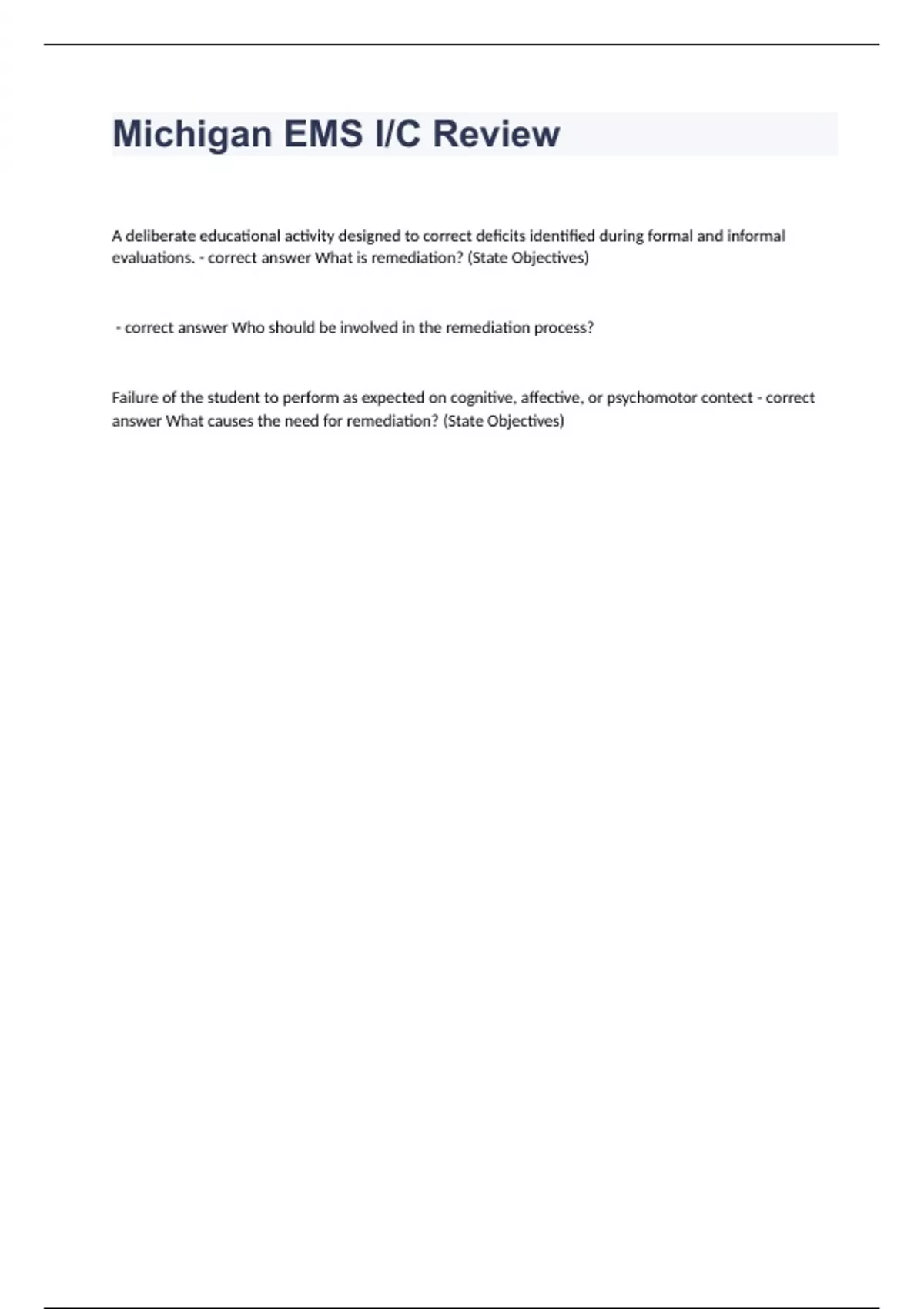 Michigan EMS I C ReviewA deliberate educational activity designed to correct deficits identified during formal and informal evaluations. - correct answer What is remediation? (State Objectives) - correct answer Who should be involved in the remediation process? Failure of the student to perform as expected on cognitive, affective, or psychomotor contect - correct answer What causes the need for remediation? (State Objectives