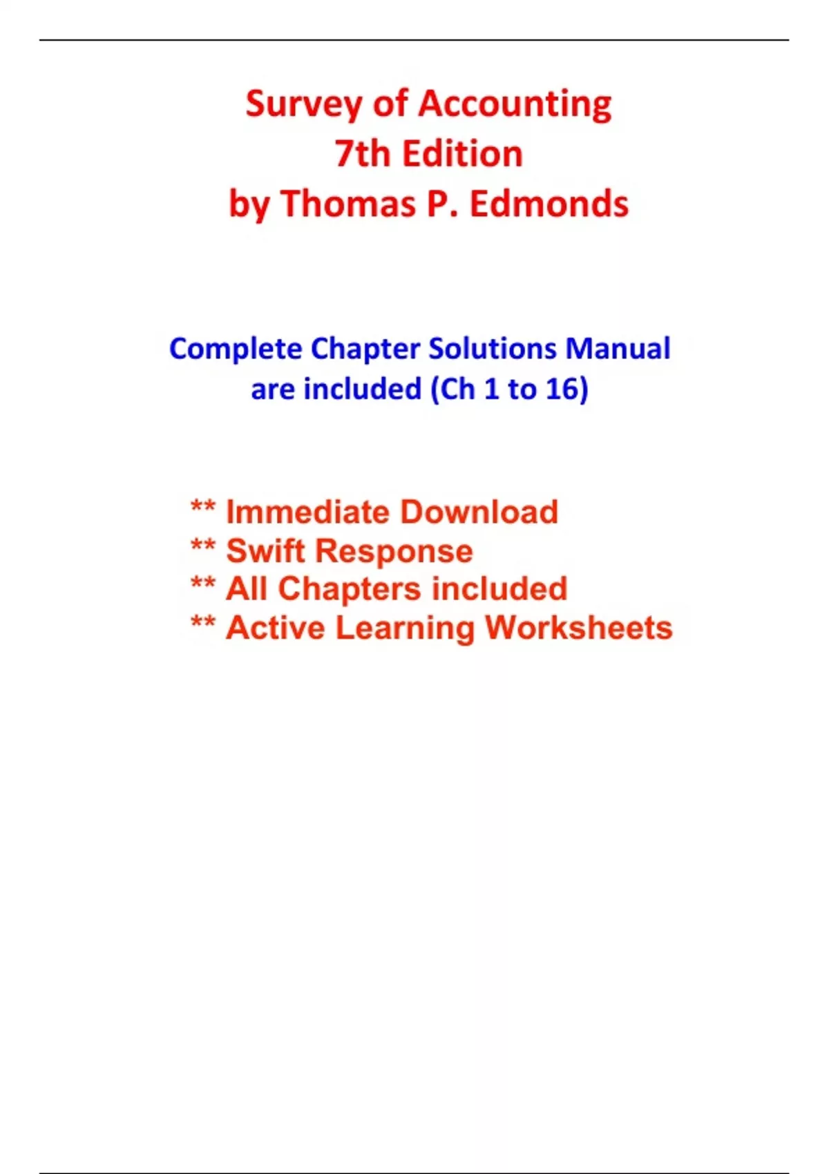 Complete Solutions Manual for Survey of Accounting, 7th Edition by Thomas P. Edmonds, Christopher T. Edmonds, Philip R. Olds, Frances M. McNair, Bor-Yi Tsay ; ISBN13: 9781266211393. Full Chapters included Chapter 1 to 16. Chapter 1. An Introduction to Accounting. Chapter 2. Accounting for Accruals and Deferrals. Chapter 3. Accounting for Merchandising Businesses. Chapter 4. Internal Controls, Accounting for Cash and Ethics. Chapter 5. Accounting for Receivables and Inventory Cost Flow. Chapter 6. Accounting for Long-Term Operational Assets. Chapter 7. Accounting for Liabilities. Chapter 8. Proprietorships, Partnerships, and Corporations. Chapter 9. Financial Statement Analysis. Chapter 10. An Introduction to Management Accounting. Chapter 11. Cost Behavior, Operating Leverage, and Profitability Analysis. Chapter 12. Cost Accumulation, Tracing, and Allocation. Chapter 13. Relevant Information for Special Decisions. Chapter 14. Planning for Profit and Cost Control. Chapter 15. Performance Evaluation. Chapter 16. Planning for Capital Investments.