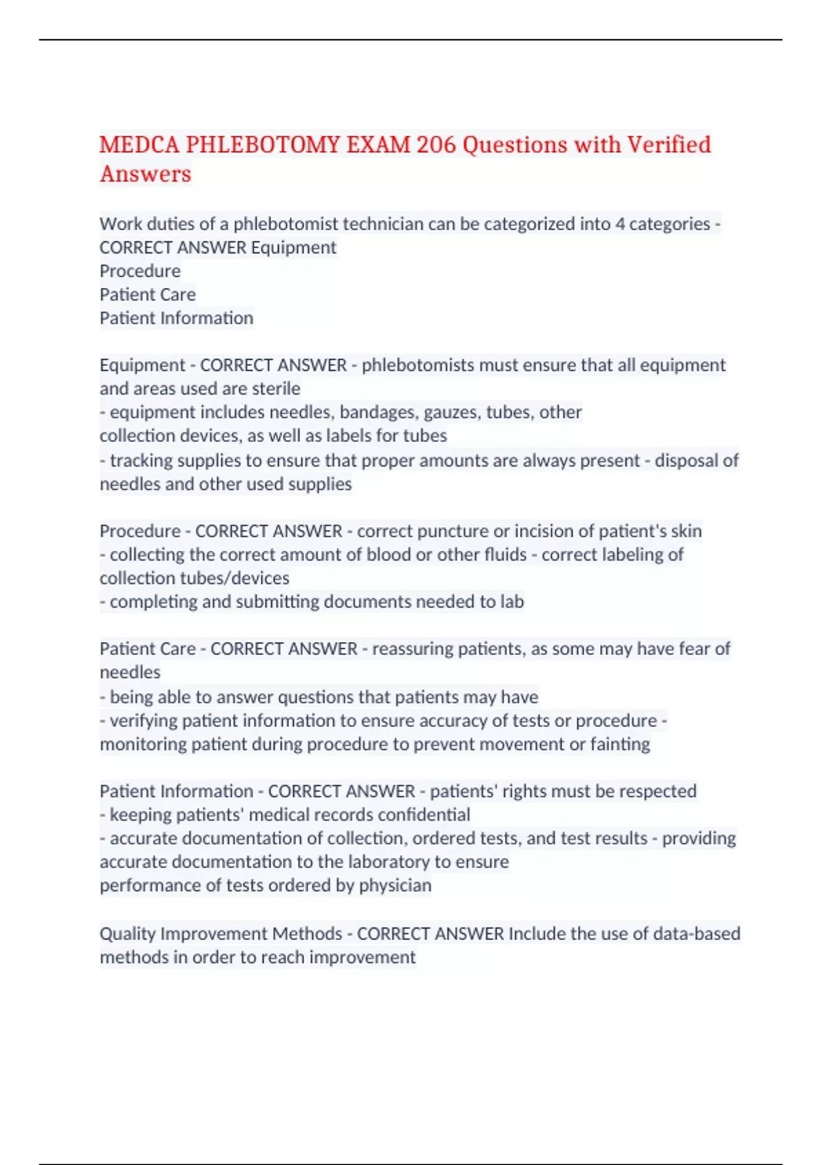 MEDCA PHLEBOTOMY EXAM 206 Questions with Verified Answers Work duties of a phlebotomist technician can be categorized into 4 categories - CORRECT ANSWER Equipment Procedure Patient Care Patient Information Equipment - CORRECT ANSWER - phlebotomists must ensure that all equipment and areas used are sterile - equipment includes needles, bandages, gauzes, tubes, other collection devices, as well as labels for tubes - tracking supplies to ensure that proper amounts are always present - disposal of needles and other used supplies Procedure - CORRECT ANSWER - correct puncture or incision of patient's skin - collecting the correct amount of blood or other fluids - correct labeling of collection tubes/devices - completing and submitting documents needed to lab Patient Care - CORRECT ANSWER - reassuring patients, as some may have fear of needles - being able to answer questions that patients may have - verifying patient information to ensure accuracy of tests or procedure - monitoring patient during procedure to prevent movement or fainting Patient Information - CORRECT ANSWER - patients' rights must be respected - keeping patients' medical records confidential - accurate documentation of collection, ordered tests, and test results - providing accurate documentation to the laboratory to ensure performance of tests ordered by physician Quality Improvement Methods - CORRECT ANSWER Include the use of data-based methods in order to reach improvement Include flow charts and pareto charts Flowchart - CORRECT ANSWER - used to break out components into diagrams in order to understand a process Pareto Chart - CORRECT ANSWER - bar charts are made that show the frequency of problems What does quality improvement for specimen collection involve? - CORRECT ANSWER Technique of Phlebotomist Frequency of hematoma Recollection Rates What is included in quality control records - CORRECT ANSWER Expiration Date Stability Information Storage Information Proper Use Precision of testing supplies/reagents Accuracy of testing supplies/reagents Where can phlebotomists work? - CORRECT ANSWER Hospital Clinic Doctor's office Laboratories Blood Banks Research Firms Pharmaceutical Firms Hospital - CORRECT ANSWER institution which provides medical and surgical treatment Clinic - CORRECT ANSWER institution or hospital department focusing on diagnosis and care of outpatients Doctor's Office - CORRECT ANSWER suite/office where doctors receive and treat patients Laboratory - CORRECT ANSWER building or room where tests are performed to evaluate specimens in order to diagnose medical conditions Blood Bank - CORRECT ANSWER institution where blood is collected from donors, and then stored and prepared for transfusion Research Firm - CORRECT ANSWER institution equipped for scientific/medical research that may specialize in basic research or on specific areas Pharmaceutical Firm - CORRECT ANSWER institution that develops and markets drugs for use as medications How must all needles be discarded? - CORRECT ANSWER intact What does it mean if an infection is classified as nosocomical - CORRECT ANSWER A patient developed the infection while they were in the hospital that was not present before entering the hospital What is included in the chain of infection - CORRECT ANSWER source susceptible host poor isolation technique Hygiene - CORRECT ANSWER wash hands with soap and water if they are visibly dirty good hand-hygiene techniques reduce number of outbreaks of infections hand washing is the single most important way to prevent spread of infection Equipment used to control infections - CORRECT ANSWER gloves, masks, goggles, gowns, or coats autoclaves (instruments for sterilizing under pressure) Emergency Needle Stick Information - CORRECT ANSWER if exposed to blood due to a needle stick or other sharp object, wash needle stick and cut with soap and water flush mouth, eyes, and skin with water report the incident to a supervisor seek medical treatment Blood Pressure - CORRECT ANSWER pressure exerted by circulating blood upon the walls of blood vessels Usually refers to the arterial pressure of systemic circulation When does blood pressure decrease - CORRECT ANSWER decreases as the circulating blood moves away from the heart through the arteries Where does blood pressure drop most rapidly - CORRECT ANSWER along the small arteries and arterioles Decreases continuously as it moves through capillaries and back through veins to the heart What other factors can influence blood pressure in the body - CORRECT ANSWER valves in veins Gravity Pumping from contraction of skeletal muscles How is blood pressure measured - CORRECT ANSWER Systolic (maximum) over diastolic (diastolic) Systolic - CORRECT ANSWER Blood pressure at the time of contraction Specifically during contraction of the left ventricle Systolic contraction is contraction of the ventricles Heard during the normal first and second heart sound Diastolic - CORRECT ANSWER Blood pressure when the heart is in relaxation and expansion Minimum arterial pressure when the ventricles are filling with blood Heard during diastole, when the heart relaxes Pulse/ Heart Rate - CORRECT ANSWER rhythmical expansion of arteries due to contractions of the heart Recorded as beats per minute Where can a persons pulse be felt? - CORRECT ANSWER any place that will allow an artery to be compressed against a bone Radial Artery Carotid Artery Brachial Artery Popliteal Artery Posterior Tibial Artery Which finger can not be used to measure pulse? - CORRECT ANSWER Thumb: it has a pulse of its own Is a lower or higher pulse rate better? - CORRECT ANSWER Lower Although, 60 may be dangerous Newborn Pulse - CORRECT ANSWER 120 - 160 beats per minute 1 month-12 months Pulse - CORRECT ANSWER 80-140 1-2 years pulse - CORRECT ANSWER 80-130 2-6 years pulse - CORRECT ANSWER 75-120 6-12 years pulse - CORRECT ANSWER 75-110 13+ pulse - CORRECT ANSWER 60-100 adult athletes pulse - CORRECT ANSWER 40-60 What are blood cells called - CORRECT