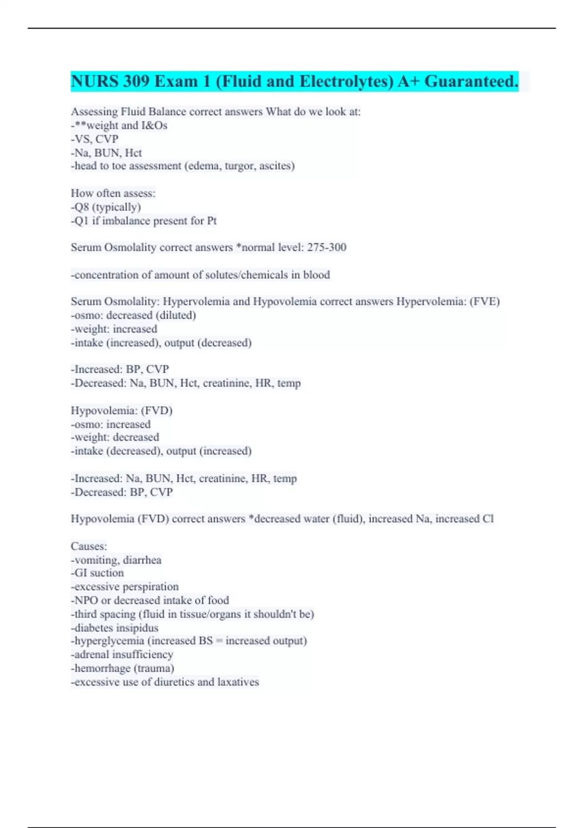 Assessing Fluid Balance correct answers What do we look at: -**weight and I&Os -VS, CVP -Na, BUN, Hct -head to toe assessment (edema, turgor, ascites) How often assess: -Q8 (typically) -Q1 if imbalance present for Pt Serum Osmolality correct answers *normal level: 275-300 -concentration of amount of solutes/chemicals in blood Serum Osmolality: Hypervolemia and Hypovolemia correct answers Hypervolemia: (FVE) -osmo: decreased (diluted) -weight: increased -intake (increased), output (decreased) -Increased: BP, CVP -Decreased: Na, BUN, Hct, creatinine, HR, temp Hypovolemia: (FVD) -osmo: increased -weight: decreased -intake (decreased), output (increased) -Increased: Na, BUN, Hct, creatinine, HR, temp -Decreased: BP, CVP Hypovolemia (FVD) correct answers *decreased water (fluid), increased Na, increased Cl Causes: -vomiting, diarrhea -GI suction -excessive perspiration -NPO or decreased intake of food -third spacing (fluid in tissue/organs it shouldn't be) -diabetes insipidus -hyperglycemia (increased BS = increased output) -adrenal insufficiency -hemorrhage (trauma) -excessive use of diuretics and laxatives