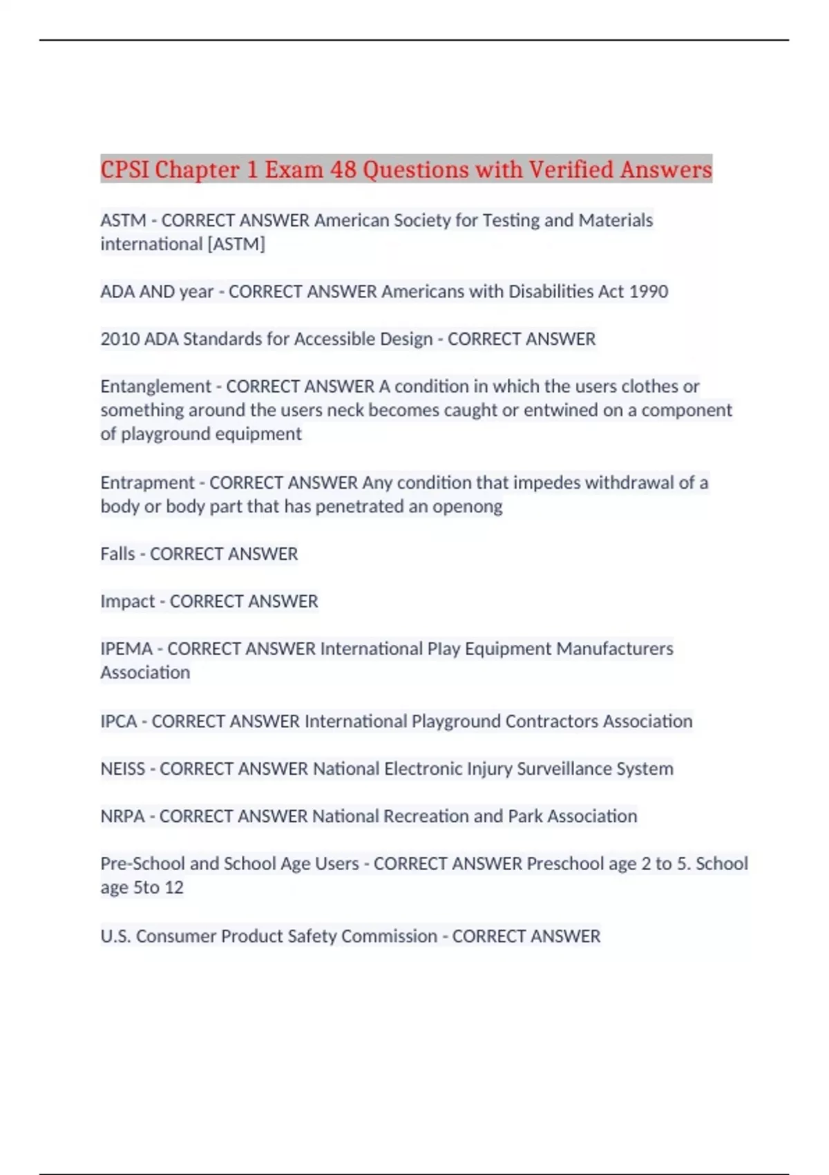 CPSI Chapter 1 Exam 48 Questions with Verified Answers ASTM - CORRECT ANSWER American Society for Testing and Materials international [ASTM] ADA AND year - CORRECT ANSWER Americans with Disabilities Act 1990 2010 ADA Standards for Accessible Design - CORRECT ANSWER Entanglement - CORRECT ANSWER A condition in which the users clothes or something around the users neck becomes caught or entwined on a component of playground equipment Entrapment - CORRECT ANSWER Any condition that impedes withdrawal of a body or body part that has penetrated an openong Falls - CORRECT ANSWER Impact - CORRECT ANSWER IPEMA - CORRECT ANSWER International PIay Equipment Manufacturers Association IPCA - CORRECT ANSWER International Playground Contractors Association NEISS - CORRECT ANSWER National Electronic Injury Surveillance System NRPA - CORRECT ANSWER National Recreation and Park Association Pre-School and School Age Users - CORRECT ANSWER Preschool age 2 to 5. School age 5to 12 U.S. Consumer Product Safety Commission - CORRECT ANSWER What's the Law in the United States? - CORRECT ANSWER -There is no federal playground safety law for the entire U.S. -Several states have passed public playground legislation. -California is the only state to mandate playground inspections. -All other states have enforcement of playground safety criteria as a legal n court, although it may not be 100% attainable by public agencies . Major U.S. organizations Concerned with playground safety? - CORRECT ANSWER a. National Recreation and park Association (NRPA) b. international Playground Equipment Manufacturers Association (IPEMA) c. international Playground Contractors Association (INPCA) F1292-17 ? - CORRECT ANSWER impact Attenuation of Surfacing Materials Within the Use Zone of Playground Equipment F1951 - CORRECT ANSWER Test Method for accessibility on Playgrounds on Safety Surfacing F2075 - CORRECT ANSWER Engineered Wood Fiber Safety Surfacing F2223 - CORRECT ANSWER Guide for ASTM Standards on Playground Surfacing F2373 - CORRECT ANSWER Playground Equipment for Children Under age 2 F2479 - CORRECT ANSWER Poured-in-Place Rubber Surfacing F3O12 - CORRECT ANSWER -Loose-Fill Rubber Surfacing F2049 - CORRECT ANSWER Standard for Fencing / Barriers for Playgrounds F1918 - CORRECT ANSWER Contained Play Systems F1148 - CORRECT ANSWER Residential Play Equipment Standards and Guidelines For Hazard identification come from... - CORRECT ANSWER a. National injury Data - National Electronic (NEtSS) b. Industry Experience c. Risk Management and Litigation d. Anthropometrics The difference between a RISK and a HAZARD? - CORRECT ANSWER Function of a Play Environment Help develop a child... - CORRECT ANSWER -Physically -__________ -Socially -Emotionally The scope of ASTM? - CORRECT ANSWER "lts purpose is to reduce life-threatening and debilitating injuries." The scope of the CPSC ? - CORRECT ANSWER "By following the recommended guidelines in this handbook, you and your community can create a safer playground environment for all children and contribute to the reduction of playground-related deaths and injuries." Falls are the _______________ cause of injury on public playgrounds - CORRECT ANSWER Most common cause of injury What percentage of injuries result from falls in TOTAL? - CORRECT ANSWER 79% total Percentage of falls to surface - CORRECT ANSWER 68% Percentage of injuries caused by impact? - CORRECT ANSWER 11% Percentage of injuries caused by stationary equipment? - CORRECT ANSWER 8% ASTM F1487 and CPSC Age Ranges? - CORRECT ANSWER - 2-5 eye level and center of gravity in relation to the guardrail -5-12 eye level and center of gravity in relation to the guardrail Percentage of injuries caused by moving equipment? - CORRECT ANSWER 3% Ages of children injured? - CORRECT ANSWER 26% ages 0-4 51% ages 5-9 15% ages 10-14 8o% ages 15+ Factors That Gontribute to public playground injuries - CORRECT ANSWER 1. Improper Use / poor 2. Supervision 3. Inappropriate Design 4. Installation Errors 5. Site planning issues 6. ___________________________ #1 Cause of Death and Seriously Debilitating injury? - CORRECT ANSWER Entanglement...of clothing, strings, or ropes #2 Cause of Death and Seriously Debilitating injury? - CORRECT ANSWER Cause is fall...onto hard underlying surfaces #3 Cause of Death and Seriously Debilitating injury? - CORRECT ANSWER Head and Neck Entrapment... in equipment openings/ #4 Cause of Death and Seriously Debilitating injury? - CORRECT ANSWER Impact... by tipped or loose equipment, or moving swings Rank top for leading causes of playground deaths in order of severity - CORRECT ANSWER 1. Entanglement 2. Fall 3. Head and Neck Entrapment 4. Impact CPSI program Vision - CORRECT ANSWER 1. An ACCESSIBLE, SAFE, and CHALLENGING play environment. 2. AGE APPROPRIATE equipment and activities. 3. COMPLIANCE with standards and guidelines. Plus...Children Having Fun! ***The most common cause of injury on public playgrounds is... - CORRECT ANSWER Falls (79%) Which of the following ASTM documents should be used as a reference when selecting a surfacing system to be installed in a public playground? F2075, F2049, F2223, F2373 - CORRECT ANSWER F2223 ***what is the most common cause of playground fatalities? - CORRECT ANSWER Entanglement... of clothing, strings, or ropes