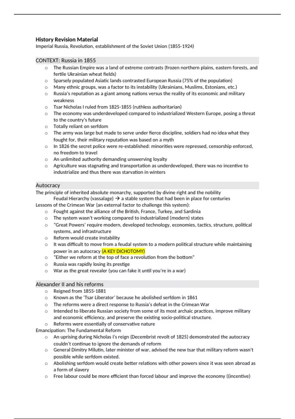 This revision material includes both topics of the ib history P3 exams and is based on the 2023 exams syllabus. Versailles to Berlin includes: conditions in Europe 1919, Paris Peace conferences, The big Three, League of Nations, Nazism, disarmament, Mandates, Great Depression, etc. Imperial Russia, Revolution, Soviet Union includes: Russia in 1855, Autocracy, Alexander II and reforms, Age of Counter reform, Nicholas II the last of the Romanovs, 1905 revolution, WW1, 1917 Revolution, Lenin and Trotsky, Civil War, War communism, NEP, etc.