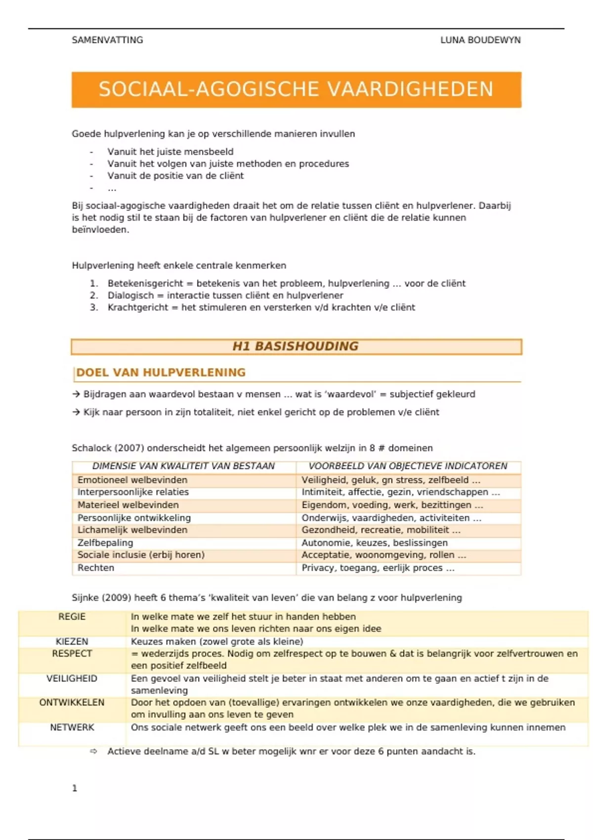 Sijnke (2009) heeft 6 thema’s ‘kwaliteit van leven’ die van belang z voor hulpverlening