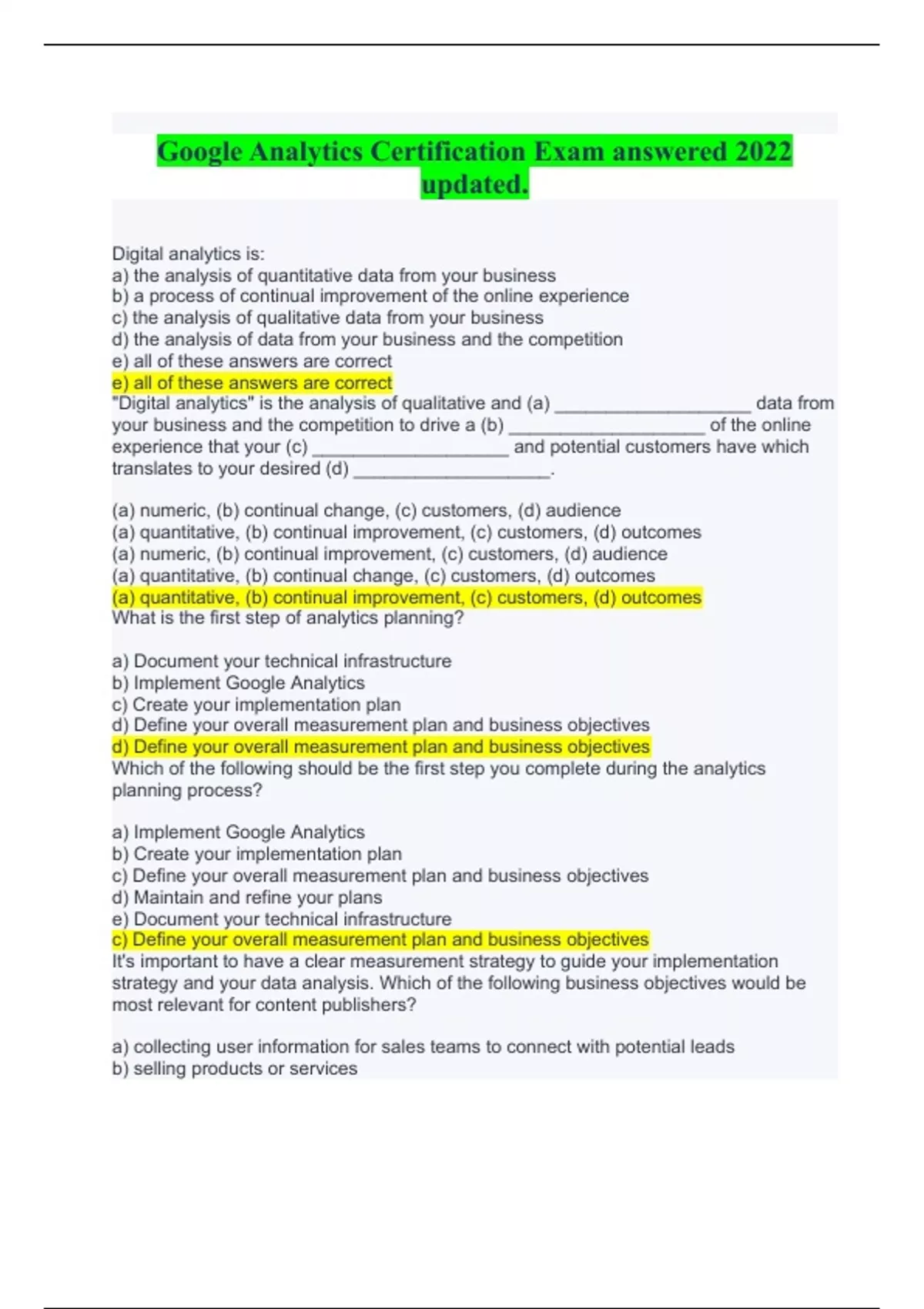 Google Analytics Certification Exam answered 2022 updated. Digital analytics is: a) the analysis of quantitative data from your business b) a process of continual improvement of the online experience c) the analysis of qualitative data from your business d) the analysis of data from your business and the competition e) all of these answers are correct e) all of these answers are correct "Digital analytics" is the analysis of qualitative and (a) ___________________ data from your business and the competition to drive a (b) ___________________ of the online experience that your (c) ___________________ and potential customers have which translates to your desired (d) ___________________. (a) numeric, (b) continual change, (c) customers, (d) audience (a) quantitative, (b) continual improvement, (c) customers, (d) outcomes (a) numeric, (b) continual improvement, (c) customers, (d) audience (a) quantitative, (b) continual change, (c) customers, (d) outcomes (a) quantitative, (b) continual improvement, (c) customers, (d) outcomes What is the first step of analytics planning? a) Document your technical infrastructure b) Implement Google Analytics c) Create your implementation plan d) Define your overall measurement plan and business objectives d) Define your overall measurement plan and business objectives Which of the following should be the first step you complete during the analytics planning process? a) Implement Google Analytics b) Create your implementation plan c) Define your overall measurement plan and business objectives d) Maintain and refine your plans e) Document your technical infrastructure c) Define your overall measurement plan and business objectives It's important to have a clear measurement strategy to guide your implementation strategy and your data analysis. Which of the following business objectives would be most relevant for content publishers? a) collecting user information for sales teams to connect with potential leads b) selling products or ser