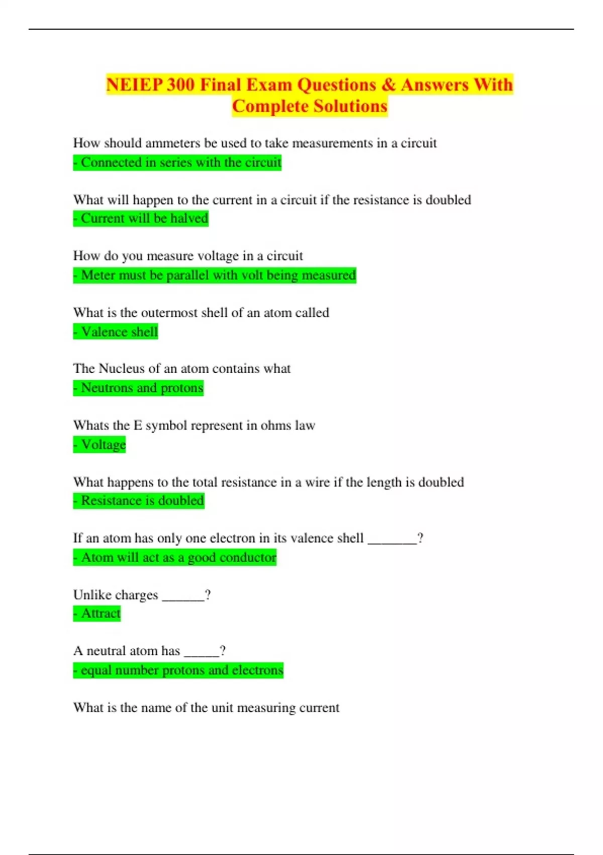NEIEP 300 Final Exam Questions & Answers With Complete Solutions-How should ammeters be used to take measurements in a circuit - Connected in series with the circuit What will happen to the current in a circuit if the resistance is doubled - Current will be halved How do you measure voltage in a circuit - Meter must be parallel with volt being measured What is the outermost shell of an atom called - Valence shell The Nucleus of an atom contains what - Neutrons and protons Whats the E symbol represent in ohms law - Voltage What happens to the total resistance in a wire if the length is doubled - Resistance is doubled If an atom has only one electron in its valence shell _______? - Atom will act as a good conductor Unlike charges ______? - Attract A neutral atom has _____? - equal number protons and electrons What is the name of the unit measuring current - amperes Describe current flow - Uniform movement of electrons from negative to positive What is the unit that measures the quantity of electrons passing a given point - Coulomb Name the unit used in measuring the potential difference across two points in a circuit - Volt What is the unit to measure opposite to current flow - Ohms
