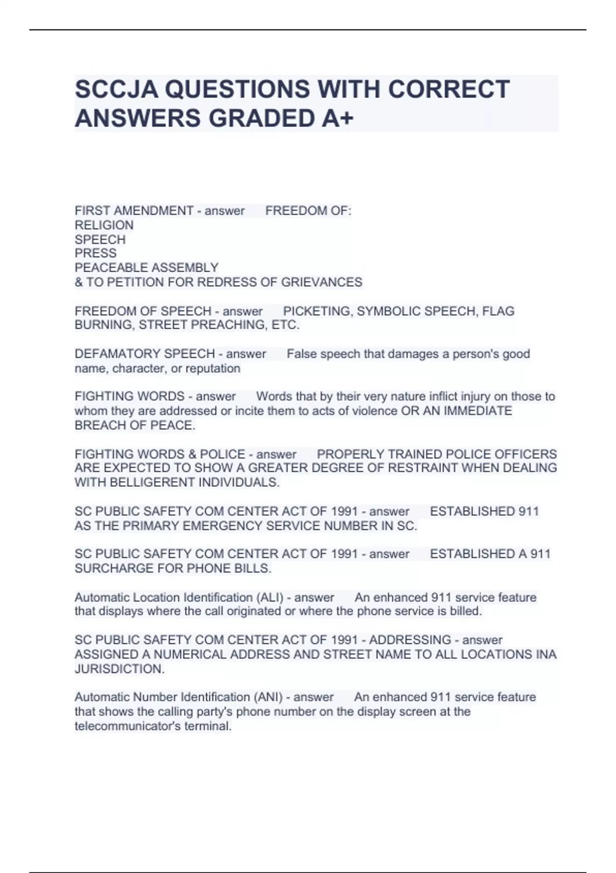 SCCJA QUESTIONS WITH CORRECT ANSWERS GRADED A+ FIRST AMENDMENT FREEDOM OF: RELIGION SPEECH PRESS PEACEABLE ASSEMBLY & TO PETITION FOR REDRESS OF GRIEVANCES FREEDOM OF SPEECH PICKETING, SYMBOLIC SPEECH, FLAG BURNING, STREET PREACHING, ETC. DEFAMATORY SPEECH False speech that damages a person's good name, character, or reputation FIGHTING WORDS Words that by their very nature inflict injury on those to whom they are addressed or incite them to acts of violence OR AN IMMEDIATE BREACH OF PEACE. FIGHTING WORDS & POLICE PROPERLY TRAINED POLICE OFFICERS ARE EXPECTED TO SHOW A GREATER DEGREE OF RESTRAINT WHEN DEALING WITH BELLIGERENT INDIVIDUALS. SC PUBLIC SAFETY COM CENTER ACT OF 1991 ESTABLISHED 911 AS THE PRIMARY EMERGENCY SERVICE NUMBER IN SC. SC PUBLIC SAFETY COM CENTER ACT OF 1991 ESTABLISHED A 911 SURCHARGE FOR PHONE BILLS. Automatic Location Identification (ALI) An enhanced 911 service feature that displays where the call originated or where the phone service is billed. SC PUBLIC SAFETY COM CENTER ACT OF 1991 - ADDRESSING ASSIGNED A NUMERICAL ADDRESS AND STREET NAME TO ALL LOCATIONS INA JURISDICTION. Automatic Number Identification (ANI) An enhanced 911 service feature that shows the calling party's phone number on the display screen at the telecommunicator's terminal. CMRS COMMERCIAL MOBILE RADIO SERVICE - CELL PHONES Public Safety Answering Point (PSAP) Any location or facility at which 9-1-1 calls are answered either by direct calling, rerouting, or diversion. PUBLIC SAFETY AGENT FUNCTIONAL AGENCY THAT PROVIDES FIRE, EMS, OR LAW ENFORCEMENT SVCS. 80% PERCENTAGE OF LINES THAT MUST BE ANSWERED WITHIN 10 SECONDS PER SC LAW. 2 LINES MINIMUM NUMBER OF LINES A PSAP MUST HAVE. 60 DAYS MINIMUM NUMBER OF DAYS A PSAP MUST SAVE RECORDINGS. 1 LINE MINIMUM NUMBER OF LINES THAT MUST HAVE TTY OR TDD PER SC LAW. IMMEDIATE PLAYBACK RECORDINGS MUST HAVE... SC PUBLIC SAFETY COM CENTER ACT OF 1991 THIS ACT ESTABLISHED MINIMUM GUIDELINES FOR 911 CENTERS IN SC. SC PUBLIC SAFETY COM CENTER ACT OF 1991 TELCOMS MUST BE CERTIFIED BY THE LAW ENFORCEMENT TRAINING COUNCIL SC PUBLIC SAFETY COM CENTER ACT OF 1991 PSAPS MUST HAVE NON EMERGENCY LINES AS WELL SC PUBLIC SAFETY COM CENTER ACT OF 1991 COIN FREE DIALING REQUIREMENT SC PUBLIC SAFETY COM CENTER ACT OF 1991 SECONDARY BACK UP NUMBER FOR EMERGENCY CALLS SC PUBLIC SAFETY COM CENTER ACT OF 1991 PUBLIC EDUCATION AND OUTREACH. $200 FINE FOR NOT HAVING 3 INCH NUMBERS ON YOUR HOUSE OR AT THE STREET, IF THE HOUSE IS MORE THAN 50 FEET FROM THE ROAD. DUPLICATE ADDRESSES EXISTING STREET NAMES WHICH ARE THE SAME IN A JURISDICTION NEED TO BE CHANGED IF THEY HAVE THE SAME ADDRESS BECAUSE SC PUBLIC SAFETY COM CENTER ACT OF 1991 DOES NOT ALLOW - SC PUBLIC SAFETY COM CENTER ACT OF 1991 NEW STREET NAMES MAY NOT DUPLICATE EXISTING ONES IN THE SAME JURISDICTION. SC ETHICS REFORM ACT OF 1991 PUBLIC EMPLOYEES CAN'T RECEIVE ANYTHING OF VALUE ANYTHING OF VALUE MONEY, BANK BILL, PROMISSORY NOTE ART, ANTIQUE, AUTOMOBILE PROMISE OF EMPLOYMENT TITLE TO REAL ESTATE ANYTHING OF VALUE DOES NOT MEAN PROMOTIONAL ITEMS LESS THAN $10. A TROPHY OR PLAQUE LESS THAN $150. ANYTHING OF VALUE DOES NOT MEAN EDUCATIONAL MATERIAL DIRECTLY RELATED TO THE OFFICIAL'S RESPONSIBILITIES ANYTHING OF VALUE DOES NOT MEAN HONORARY DEGREE ANYTHING OF VALUE DOES NOT MEAN PROMOTIONAL ITEMS GIVEN TO THE OFFICIAL ON THE SAME TERMS THEY ARE GIVEN TO THE GENERAL PUBLIC. ANYTHING OF VALUE DOES NOT MEAN CAMPAIGN CONTRIBUTIONS THAT ARE PROPERLY DISCLOSED. FCC REGULATIONS TELECOMMUNICATORS ARE NOT REQUIRED TO HAVE AN FCC RADIO LICENSE. FCC REGULATIONS - GENERAL BROADCASTING PROCEDURES TRANSMISSIONS SHOULD BE BROADCAST WITH MINIMAL TRANSMISSION TIME. FCC REGULATIONS - GENERAL BROADCASTING PROCEDURES LICENSES CAN BE SUSPENDED FOR: 1. USING PROFANE LANGUAGE 2. SENDING FALSE OR DECEPTIVE INFO. 3. USING A FALSE CALL SIGN. 4. WILLFULLY INTERFERING WITH OTHER RADIO SIGNALS. 5. UNPROFESSIONAL RADIO DEMEANOR. NCIC 2000 FUNCTIONALITY COMPUTERIZED INFORMATION SYSTEM THAT PROVIDES ACCESS TO: 1. WANTED PERSON INFORMATION 2. MISSING PERSON INFORMATION 3. UNIDENTIFIED PERSON INFORMATION 4. STOLEN PROPERTY INFORMATION 5. CRIMINAL HISTORY INFORMATION 6. INFORMATION FROM CRIMINAL INVESTIGATIONS OF CRIMES THAT ARE KNOWN OR REASONABLY BELIEVED TO HAVE OCCURRED. NCIC 2000 SECURITY GENERALLY LIMITED TO CRIMINAL JUSTICE PURPOSES. NCIC 2000 National Crime Information Center 2000, Federal Bureau of investigation; Clarksburg, West Virginia NCIC 2000 SECURITY MUST FOLLOW AN APPROVED DESIGN: 1. PHYSICAL SECURITY. 2. PASSWORD SECURITY. 3. ENCRYPTION 4. APPROVED FIREWALLS NCIC 2000 SECURITY SYSTEM MUST BE SAFEGUARDED FROM ALL THREATS AND UNAUTHORIZED ACCESS. TELECOMMUNICATORS DUTY OF CARE 1. ***SPECIAL RELATIONSHIP TO THE VICTIM*** 2. SPECIAL RELATIONSHIP TO THE INJURER. 3. ***VOLUNTARY UNDERTAKING*** 4. CREATION OF RISK. 5. STATUTORY IMPOSITION OF DUTY. ***VOLUNTARY UNDERTAKING*** PUBLIC SERVICE IS CONSIDERED A VOLUNTARY OCCUPATION. ***SPECIAL RELATIONSHIP TO THE VICTIM*** THE FORMATION OF A SHORT-TERM WORKING RELATIONSHIP BETWEEN TELCOM AND CALLER. REASONS FOR A CIVIL LAWSUIT NEGLIGENCE WILLFUL MISCONDUCT 42 U.S.C. 1983 NEGLIGENCE LEGAL DUTY TO THE PLAINTIFF BREACH OF THAT DUTY PLAINTIFF SUFFERED DAMAGES DEFENDANT'S CONDUCT CAUSED THE DAMAGES WILLFUL MISCONDUCT OR INTENTIONAL TORT WHEN THE TELCOM WILLFULLY AND DELIBERATELY CAUSES INJURY OR BREACHES HIS OR HER DUTY. 42 U.S.C. 1983 RELATING TO FEDERAL CIVIL RIGHTS. TELCOM CAN BE SUED IF: 1. THE PLAINTIFF WAS DEPRIVED BY A FEDERALLY PROTECTED CIVIL RIGHT. 2. THE TELCOM ACTED UNDER THE COLOR OF LAW. TWO CATEGORIES OF THE DUTY OF CARE RECOGNIZED BY THE LAW 1. VOLUNTARY UNDERTAKING. 2. SPECIAL RELATIONSHIP TO THE VICTIM. CONSEQUENCES OF A TELCOM'S IMPROPER ACTIONS 1. THE CALLER SN BE INJURED. 2. FIRE, EMS, OR POLICE PERSONNEL CAN BE INJURED. 3. OTHER PARTIES CAN BE INJURED. 4. PROPERTY DAMAGE CAN BE GREATER. 5. CIVIL LAWSUITS. 6. CRIMINAL CHARGES. THREE TYPES OF CIVIL LAWSUITS THAT CAN BE FILED AGAINST A T