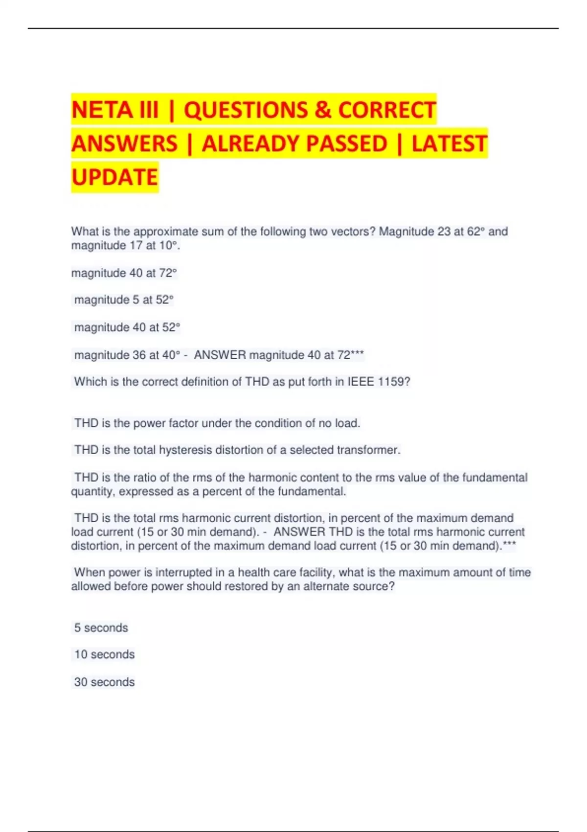 NETA III | QUESTIONS & CORRECT ANSWERS | ALREADY PASSED | LATEST UPDATE What is the approximate sum of the following two vectors? Magnitude 23 at 62° and magnitude 17 at 10°. magnitude 40 at 72° magnitude 5 at 52° magnitude 40 at 52° magnitude 36 at 40° - ANSWER magnitude 40 at 72*** Which is the correct definition of THD as put forth in IEEE 1159? THD is the power factor under the condition of no load. THD is the total hysteresis distortion of a selected transformer. THD is the ratio of the rms of the harmonic content to the rms value of the fundamental quantity, expressed as a percent of the fundamental. THD is the total rms harmonic current distortion, in percent of the maximum demand load current (15 or 30 min demand). - ANSWER THD is the total rms harmonic current distortion, in percent of the maximum demand load current (15 or 30 min demand).*** When power is interrupted in a health care facility, what is the maximum amount of time allowed before power should restored by an alternate source? 5 seconds 10 seconds 30 seconds 60 seconds - ANSWER 5 seconds*** Temporary protective grounds should be placed to create an equipotential zone ______. if concern for unexpected re-energization exists on the incoming lines near each energy source at the work location before any testing is performed - ANSWER if concern for unexpected re-energization exists *** In a circuit containing resistance and inductance, the time required for current to reach its full value involves which of the following? R/L R2 R/C L/R - ANSWER L/R*** An internal fault in a transformer can be discovered earliest using which test method? Interfacial tension Visual condition Power-Factor Dissolved-gas analysis Oxygen Content - ANSWER ***dissolved-gas analysis Which of the following is grounded in a 3-phase, 4-wire wye connected system having a voltage range between 50V and 1000V: Neutral Conductor Mid point of one phase winding One phase conductor None of the above - ANSWER neutral conductor***